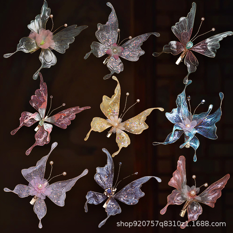 古代スタイルの液体フラワーグリッターヘアピン、ファッショナブルなデザイン、漢服蝶頭飾りアクセサリー、中国風ヘアピン、妖精ヘアアクセサリー
