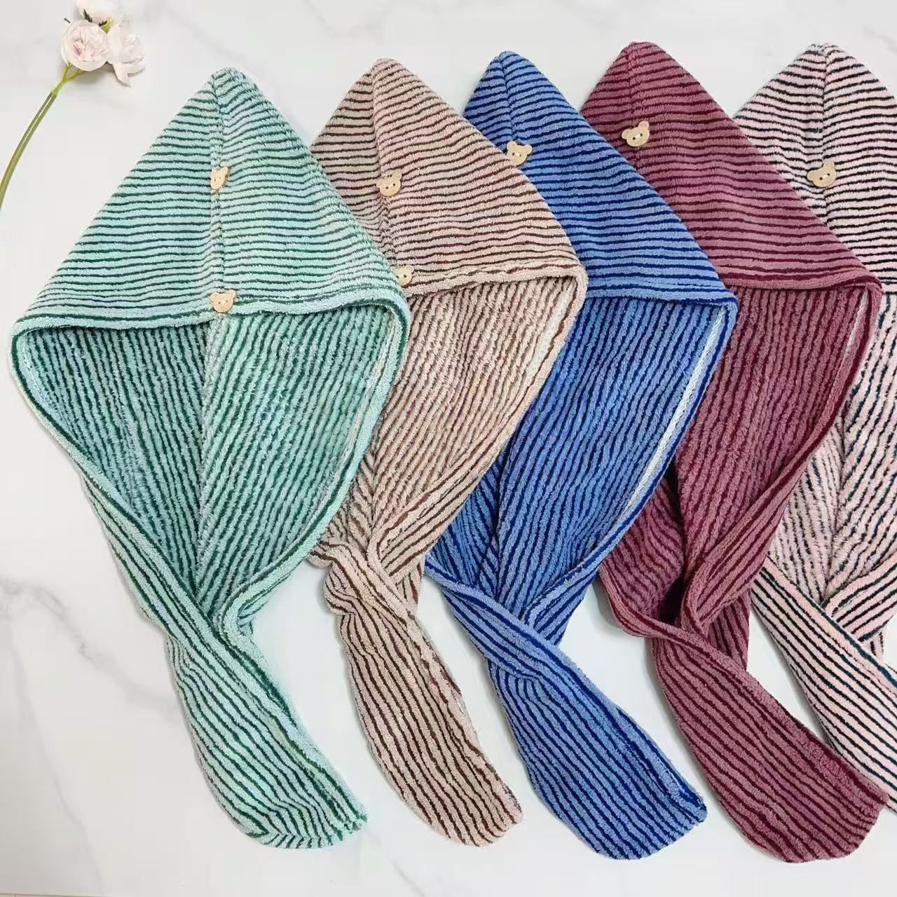 メーカー卸売りの単層の細い条の乾いた髪の帽子の女性の吸水は厚くて、頭を洗って髪を拭きます。