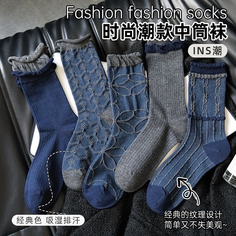 Xiaohongshu 同じ雰囲気の女性用ソックス、ネイビーブルーのボンレスレトロな女性用ミッドカーフソックス、クラシックカジュアルソックス卸売