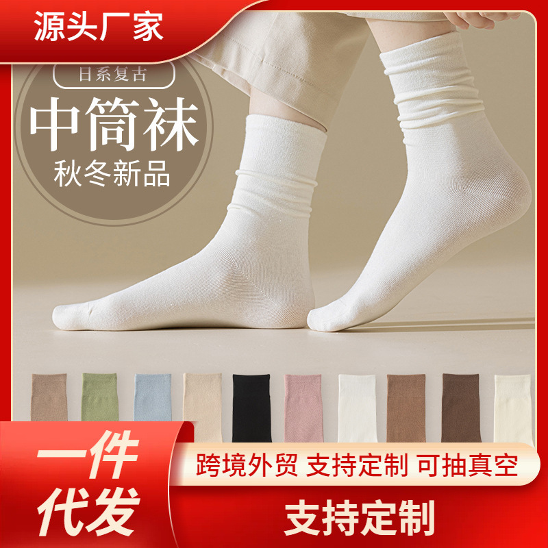 レディースミドル丈ソックス、インスタ映え、万能、産後ソックス、無地、秋冬、レトロ風、重ね履きソックス、白ソックス、ロングソックス