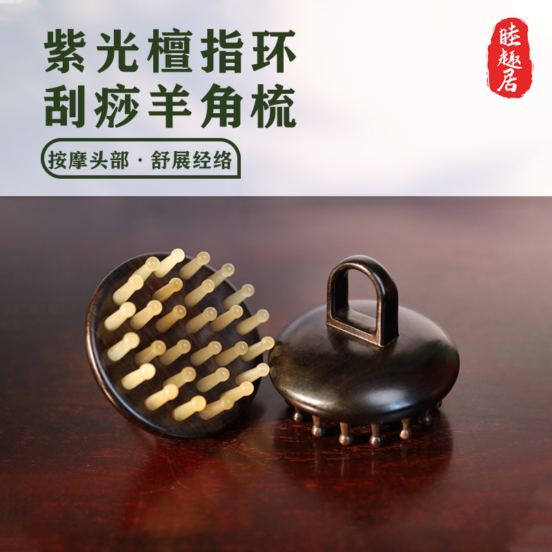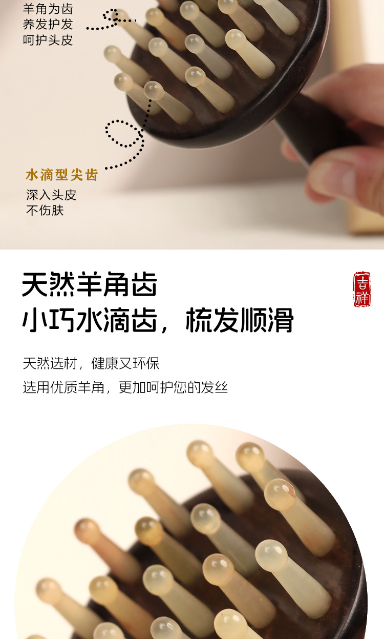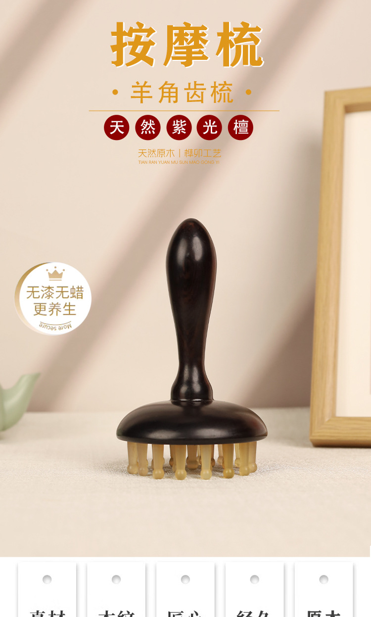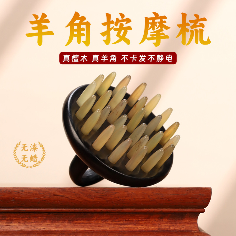 頭皮マッサージコーム、紫檀天然羊角コーム、頭部経絡コーム、洗髪ブラシ、ヘッドセラピー、刮痧、汎用指環コーム