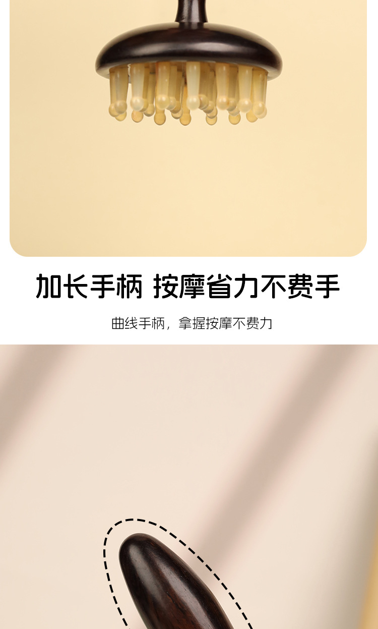 紫檀羊角経絡ブラシ、無垢材長柄マッサージブラシ、お腹揉み、腹部マッサージ、脚の刮痧、全身マッサージに万能