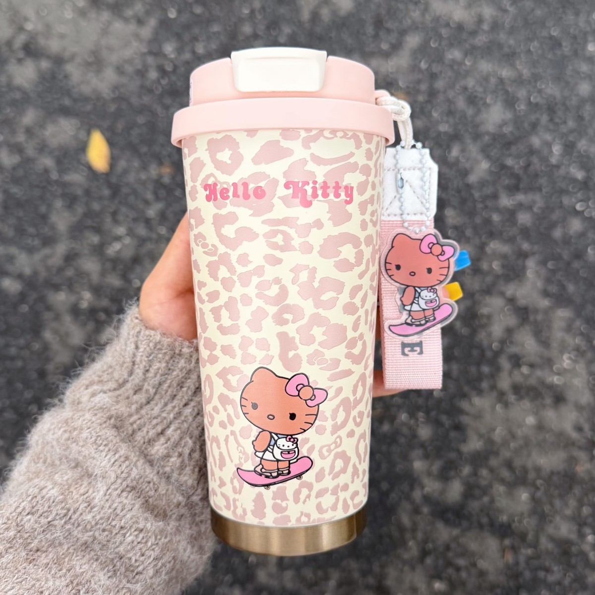 2025新款豹纹KT猫水杯316不锈钢高颜值吸管女生大容量手柄保温杯