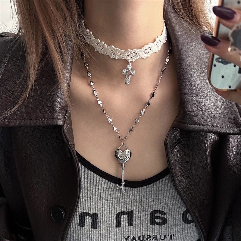甜酷白色蕾丝十字架绑带choker叠戴爱心钥匙项链女小众设计感颈链