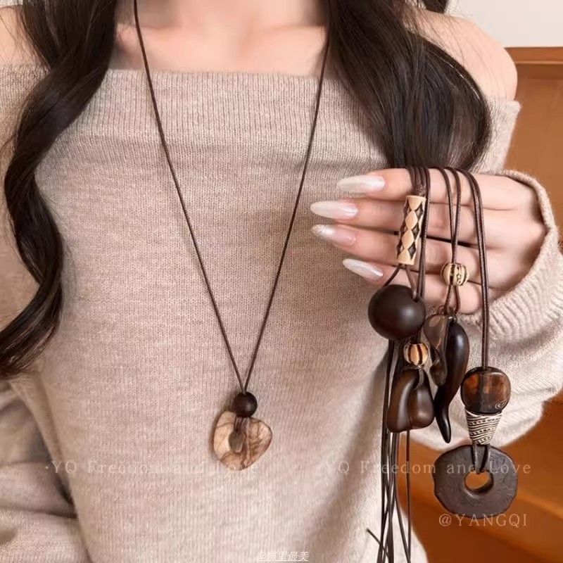 复古咖色吊坠项链女秋冬美拉德长款毛衣链高级感搭配衣服挂脖配饰