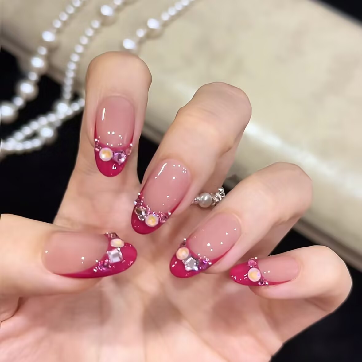 里有Liu纯手工穿戴甲美甲批发354高级显白玫红色贴钻甜辣风短甲