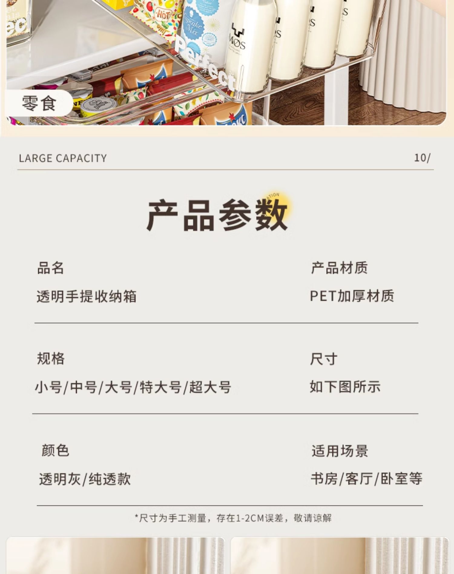仕様 小型高透明PET素材長さ27×幅18.5×高さ14.5cmハンドル付き中型高透明PET素材長さ31。
