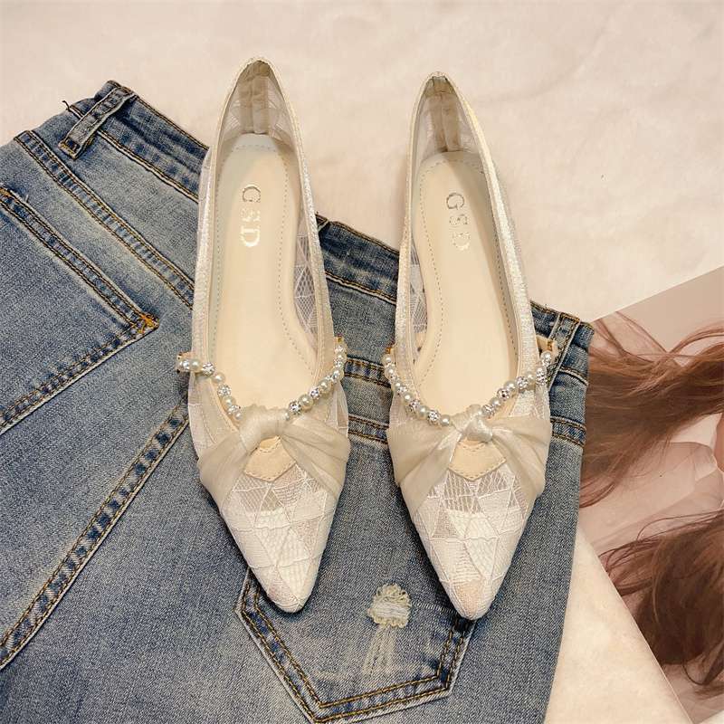 2025 春の新レースリボンビーニーシューズポインテッドトゥフラットシューズ女性の多用途妖精イブニングスタイル優しい靴