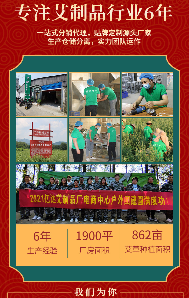 南阳亿达艾制品厂专业从事艾草基因储备、繁育、种植、产品研发、生产、制造为一体的多功能、复合式、专业化企业。我厂科学规范的工艺流程、标准化的质节点控制、严格的产品检验体系保证了产品质量的稳定可靠。我厂为自主生产型工厂,加工艾绒,艾条,艾灸等系列产品,可为不同需求客户提供艾制品OEM,ODM服务,包装设计,艾灸馆,养生馆,美容院艾制品市场定位,产品供应。