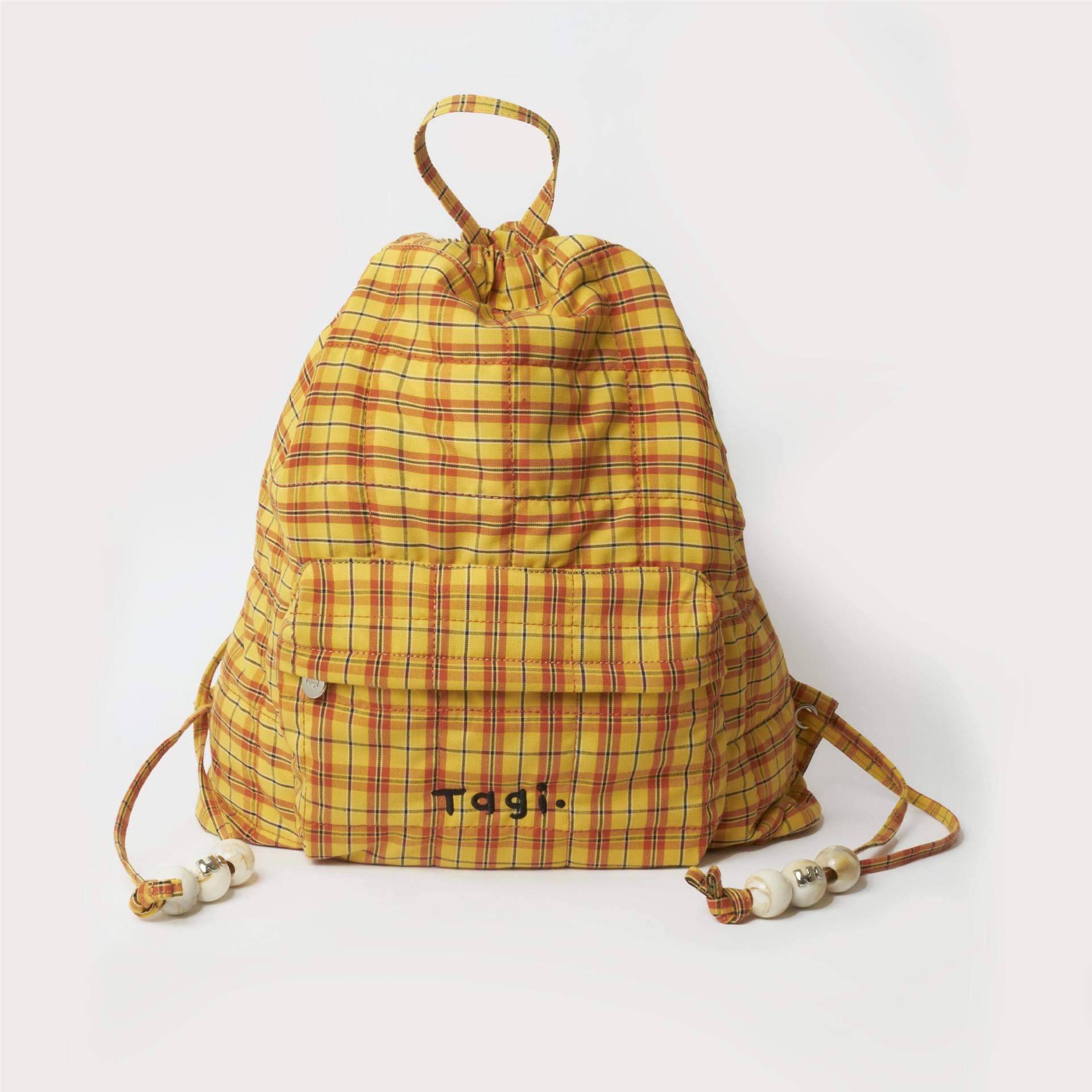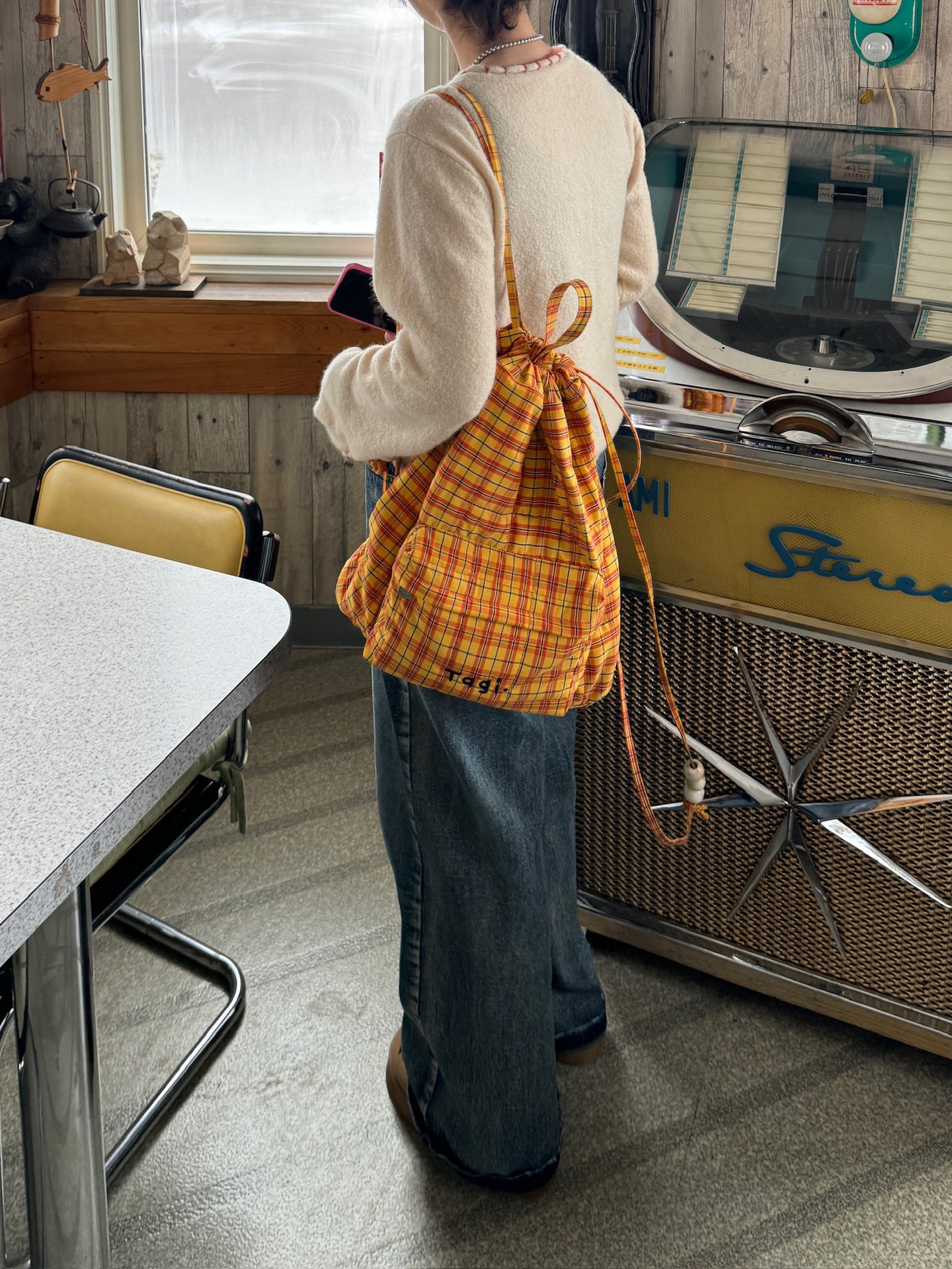 Tagi パールアクリルビーズかわいい巾着キャンバスバッグ大容量バックパックニッチレトロチェック柄オレンジ