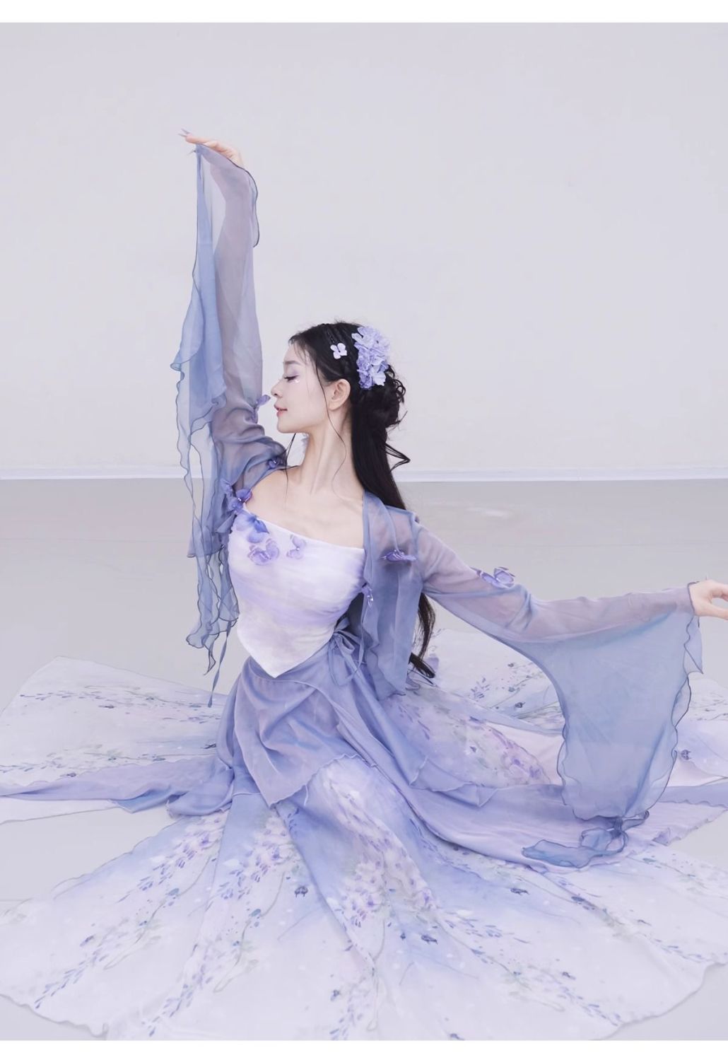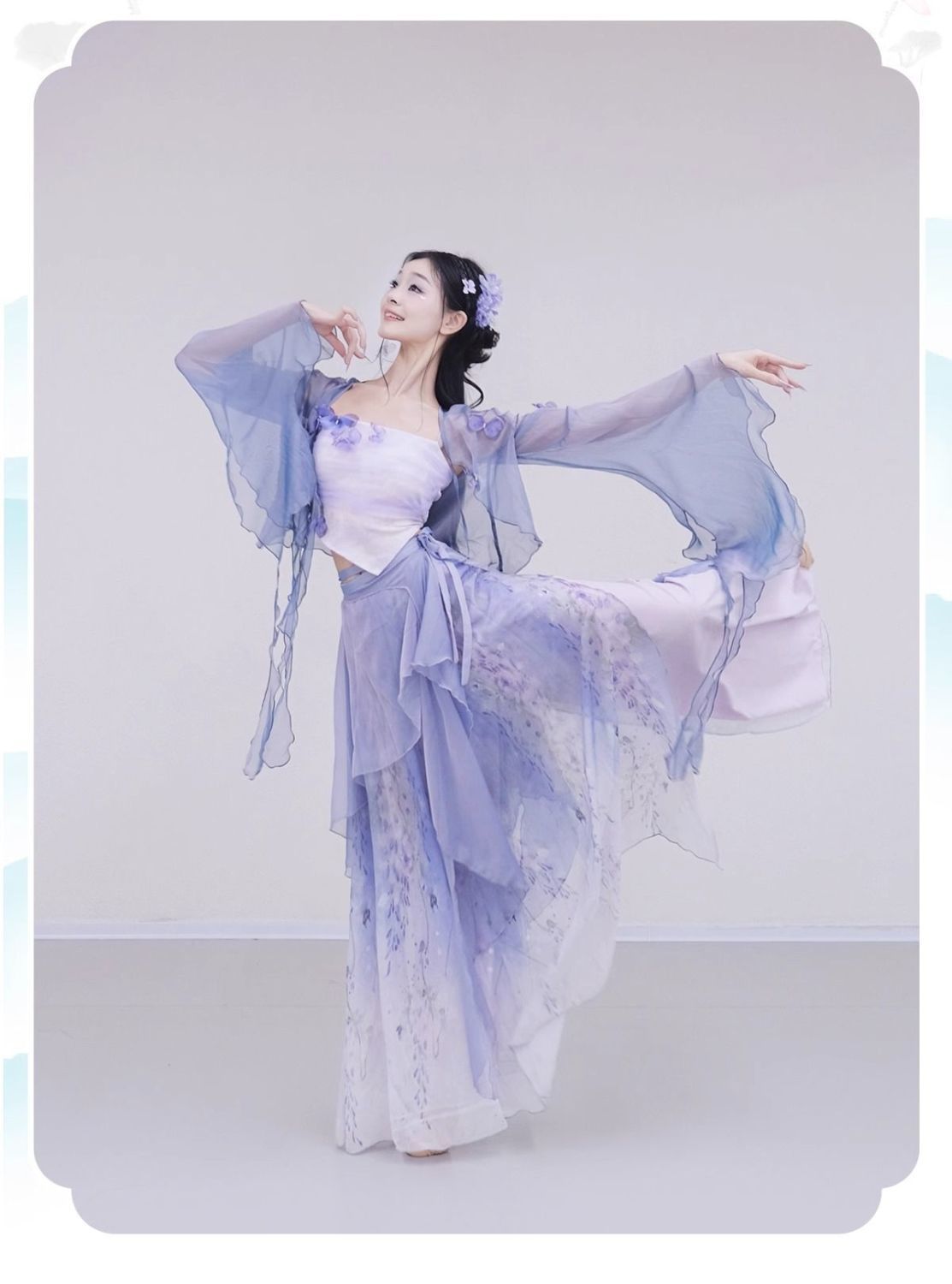 2025新款古典舞渐变仙气飘逸纱衣喇叭袖外披晕染裤裙演出服练功服