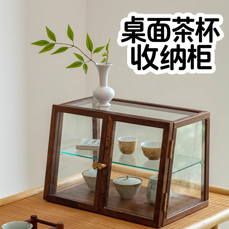 茶器収納キャビネットガラスティーセットディスプレイキャビネットブラックウォールナットデスクトップ無垢材キャビネット収納ラックカップティーセットキャビネット