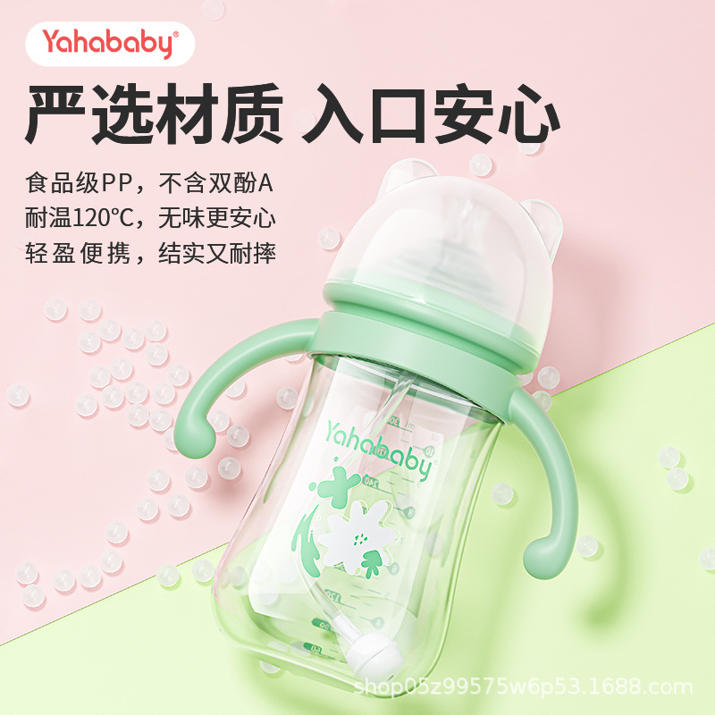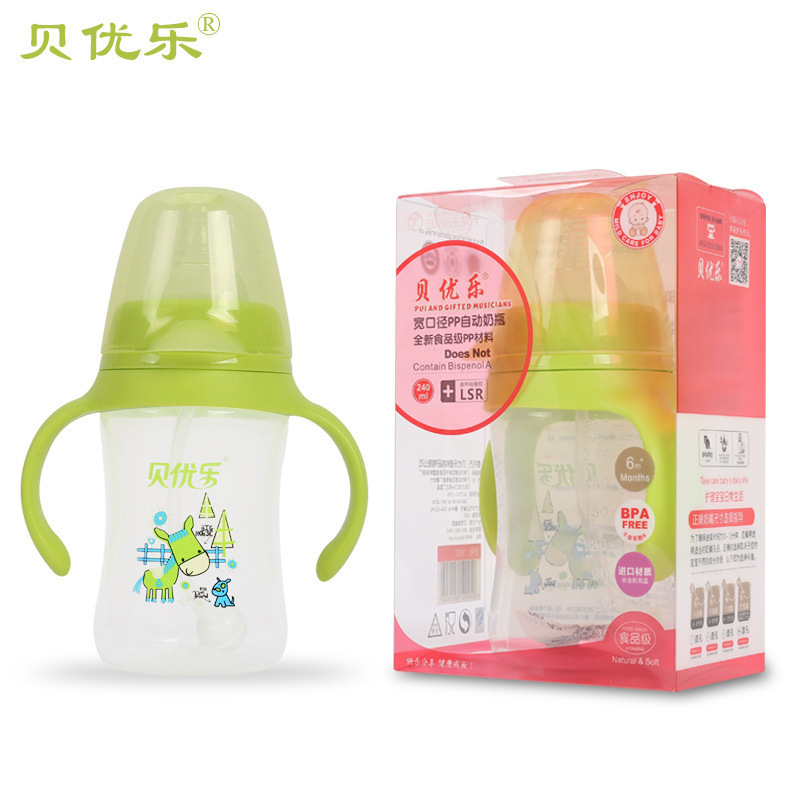批发贝优乐食品级宝宝宽口径PP奶瓶新生儿带柄防摔自动吸管PP奶瓶