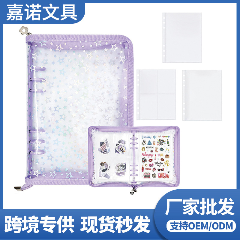 A5活页收纳册星星拉链包彩色6孔PVC活页本外壳贴纸收纳手账本学生