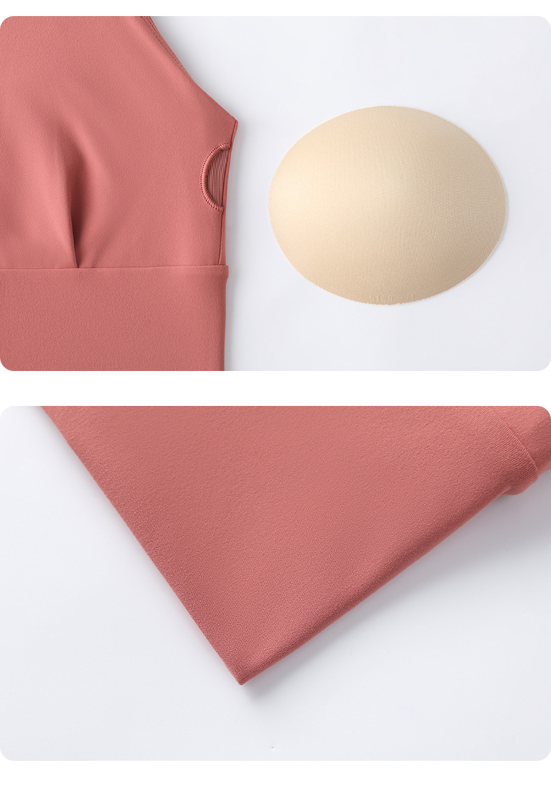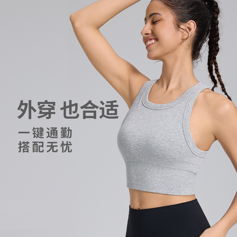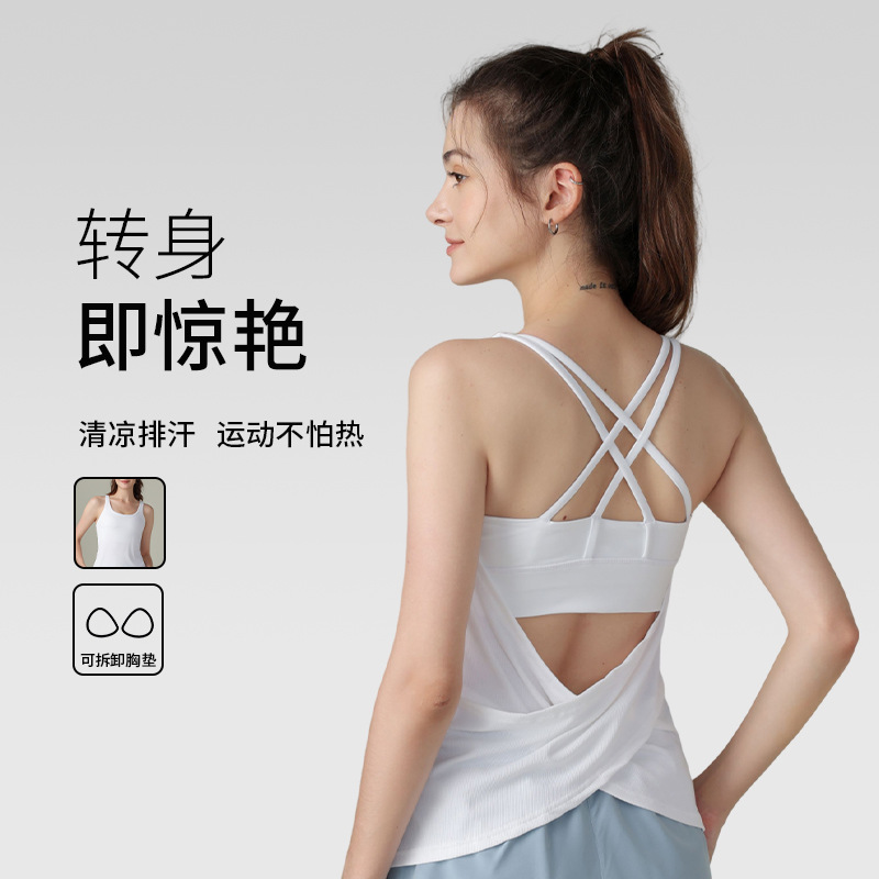 胸パッド付きの新しいリブランニングスポーツベスト、ノースリーブの美しいバックフィットネス下着、アウターウェア、多用途のヨガウェア