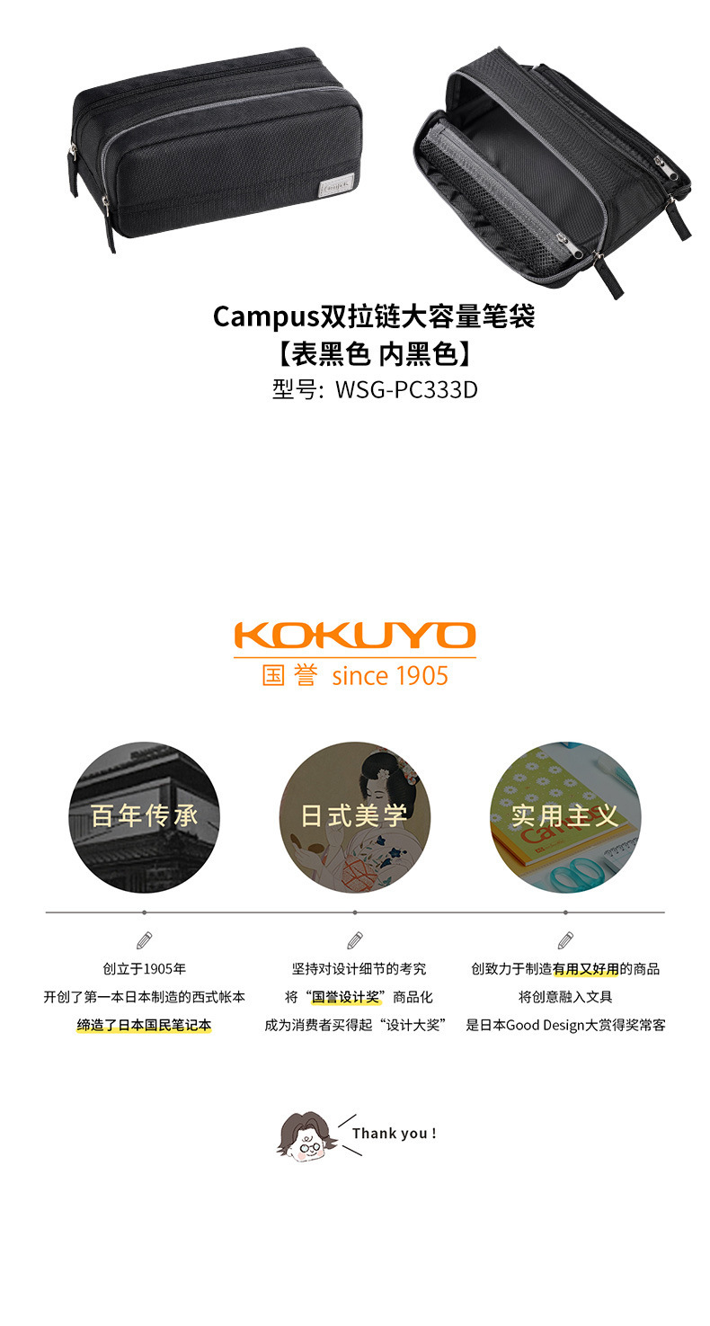 新商品日本koku国誉黒シンプル筆袋焼餅包枕包立式文房具箱大容量