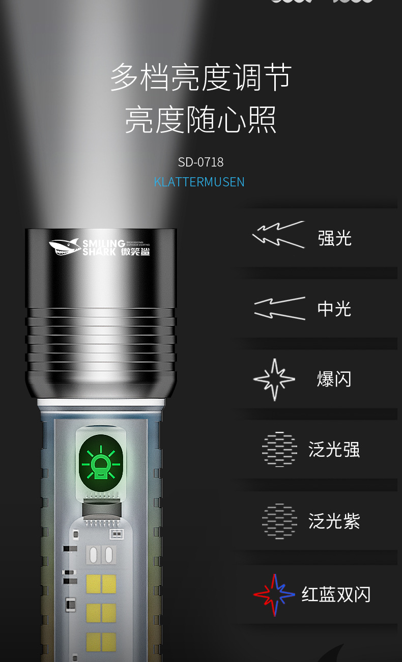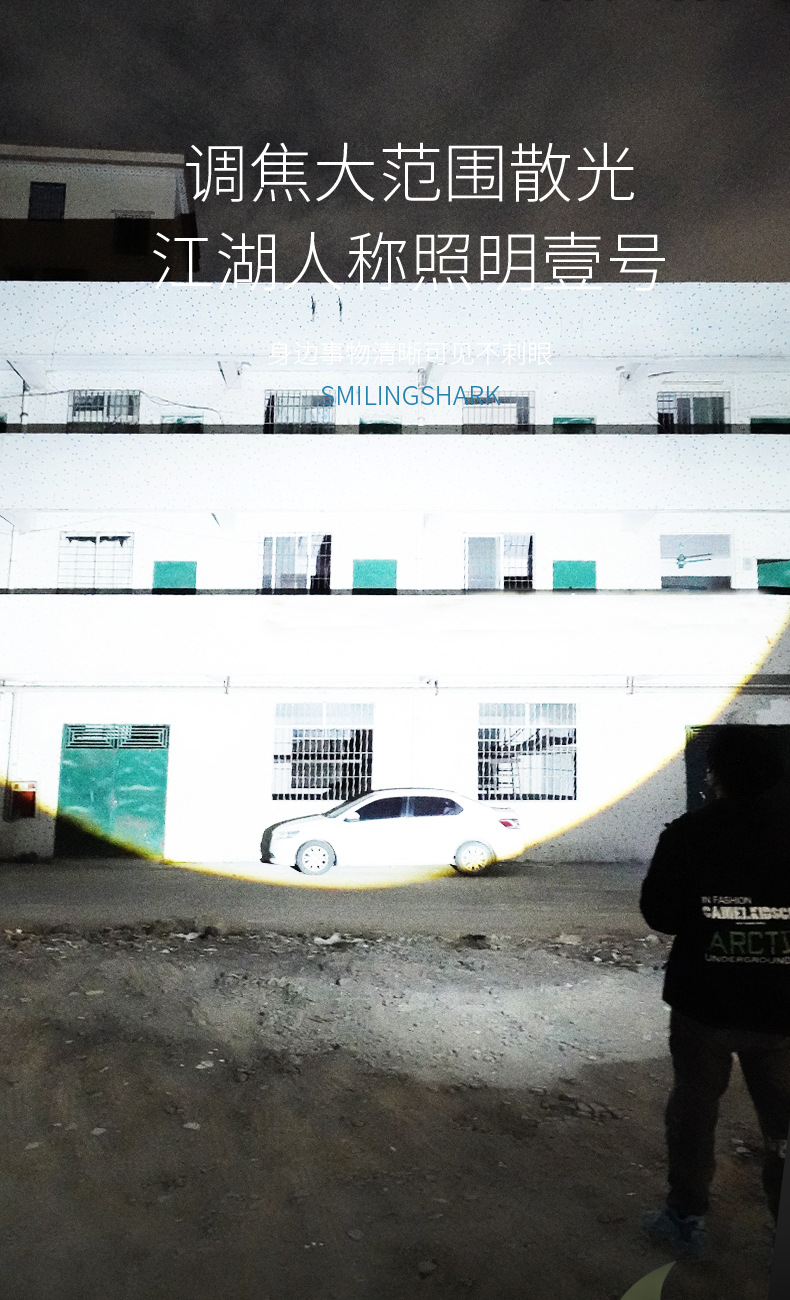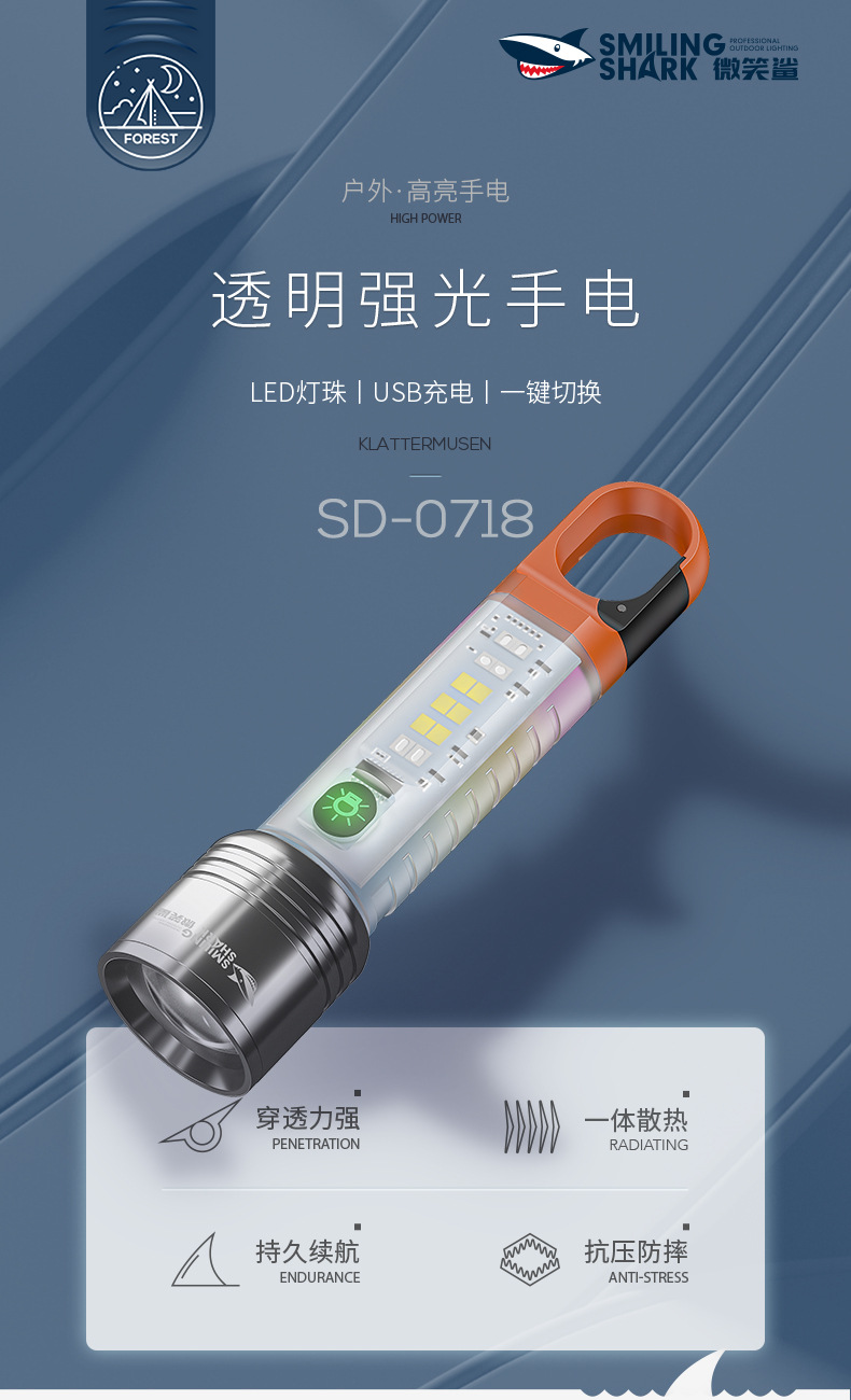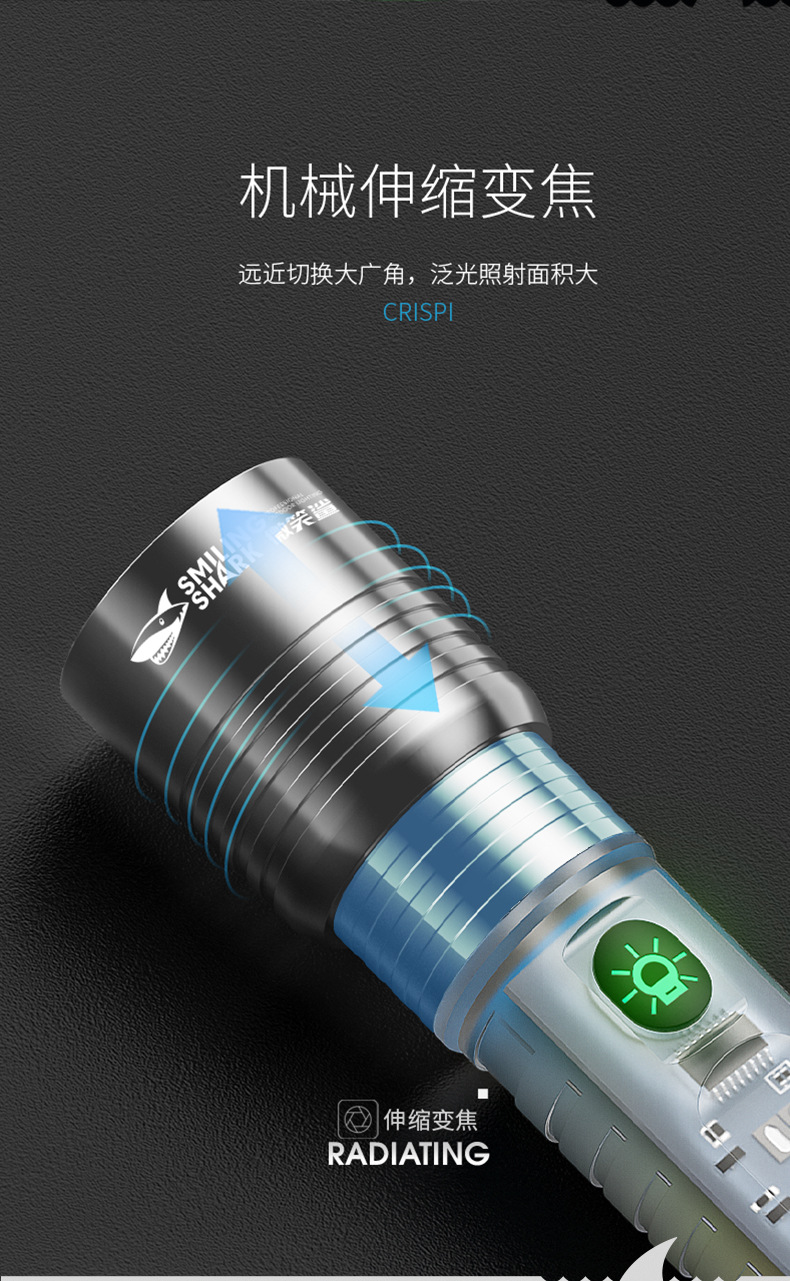 スマイルシャーク透明強力な光懐中電灯伸縮式焦点屋外ポータブルキャンプハンギングライト赤と青の点滅照明 LED ライト