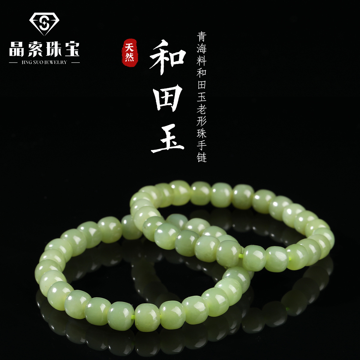 晶索天然和田玉手链女 羊脂玉圆珠碧玉简约和田玉老形珠手串