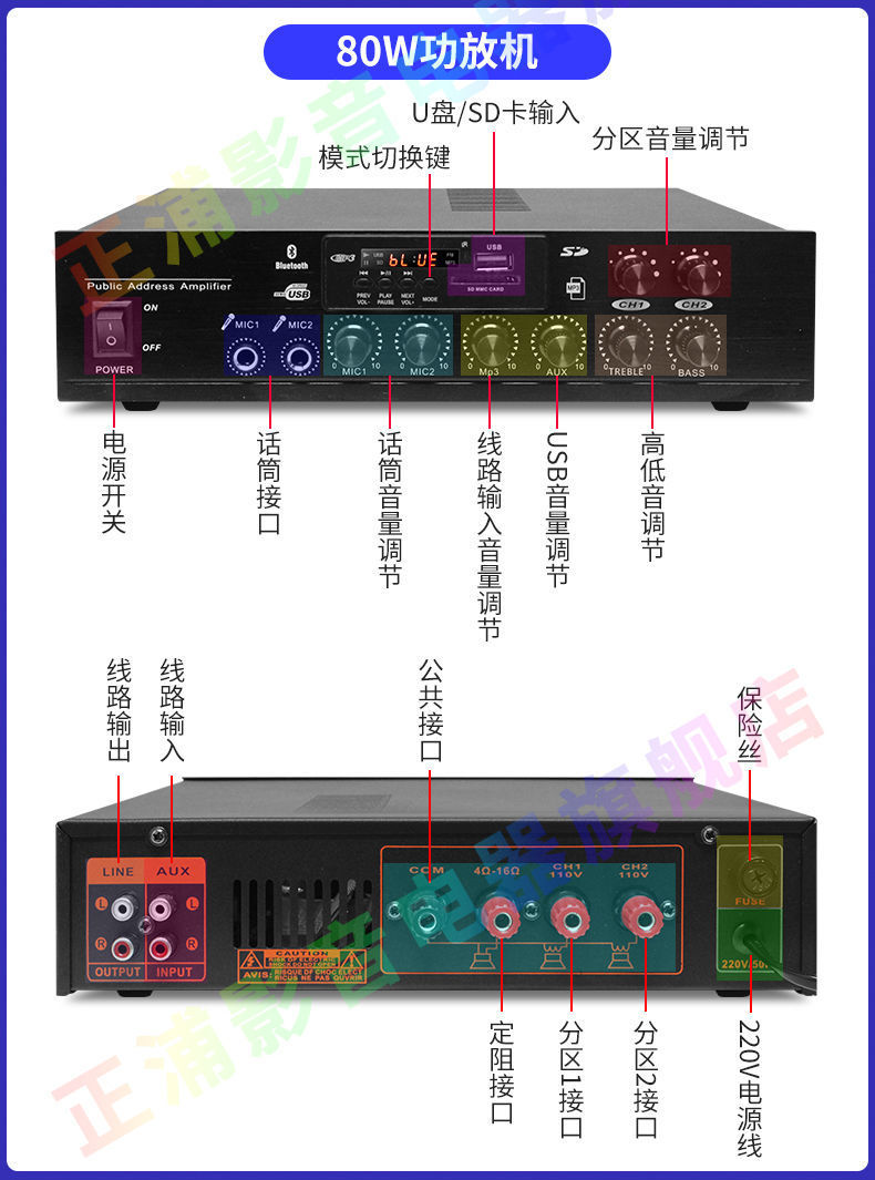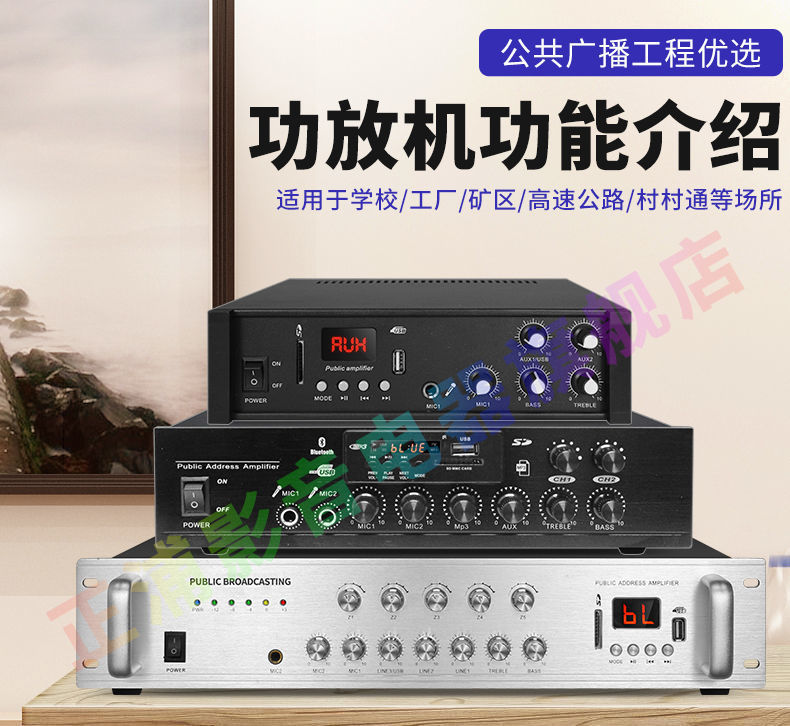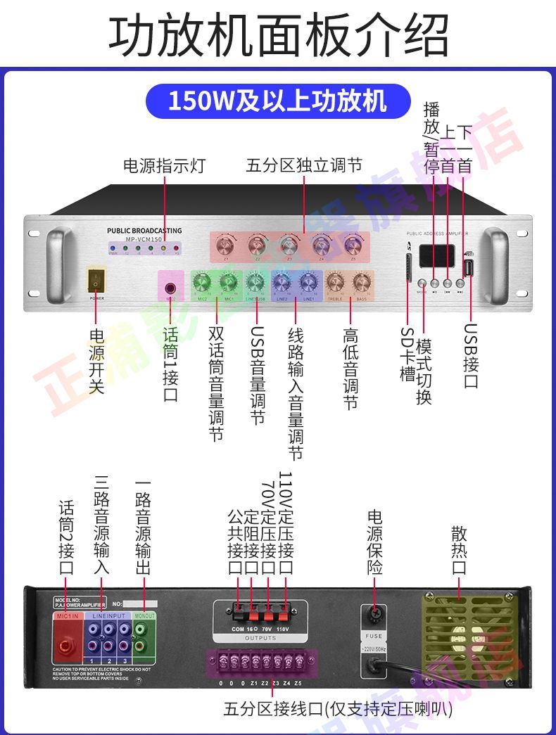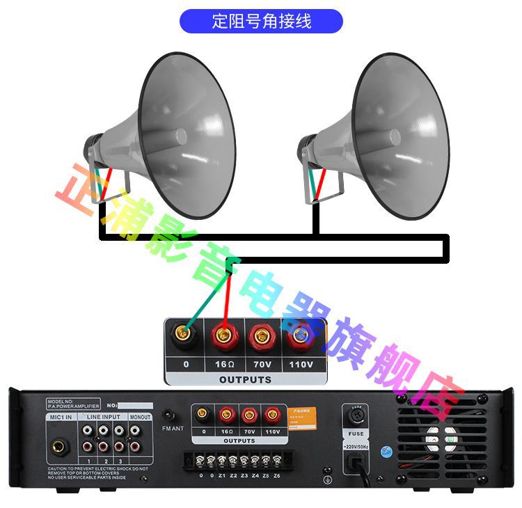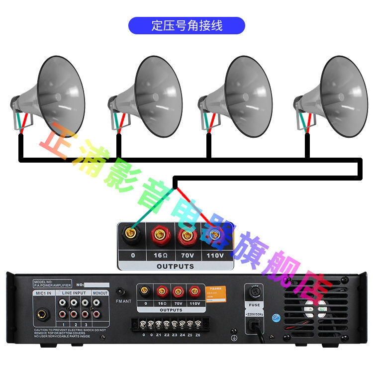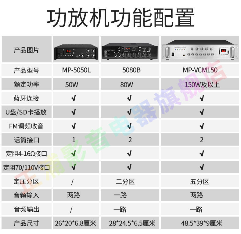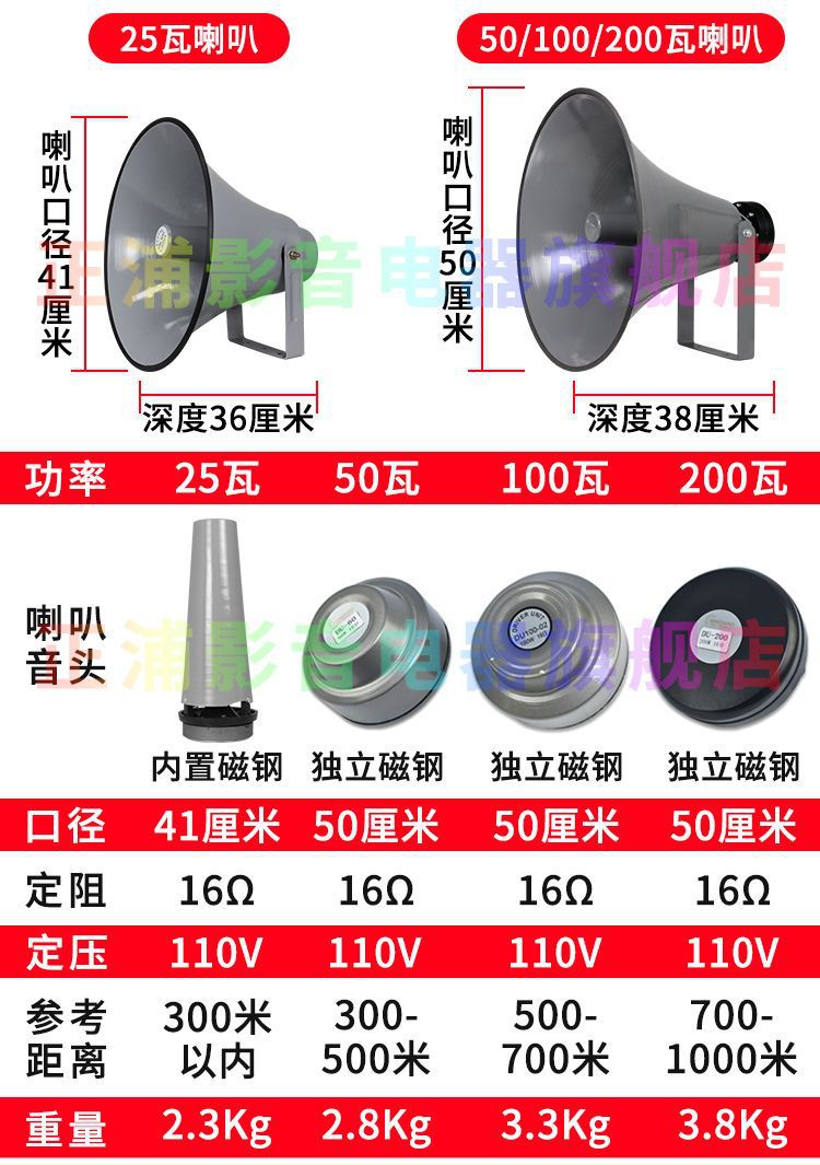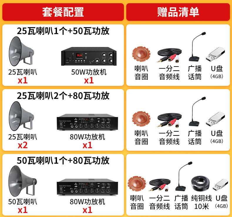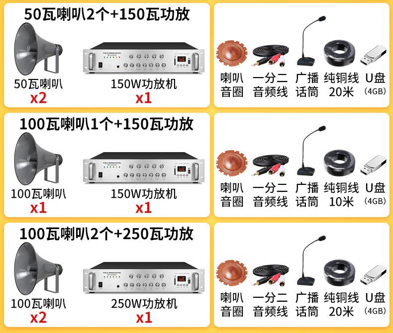 25ワットスピーカー1個+50ワットパワーアンプ,25ワットスピーカー2台+80ワットパワーアンプ,25ワットスピーカー3個+100ワットパワーアンプ,50ワットスピーカー1台+80ワットパワーアンプ,50ワットスピーカー2台+150ワットパワーアンプ,100ワットスピーカー+150ワットアンプ,100ワットスピーカー2台+250ワットアンプ,200ワットスピーカー1台+250ワットパワーアンプ