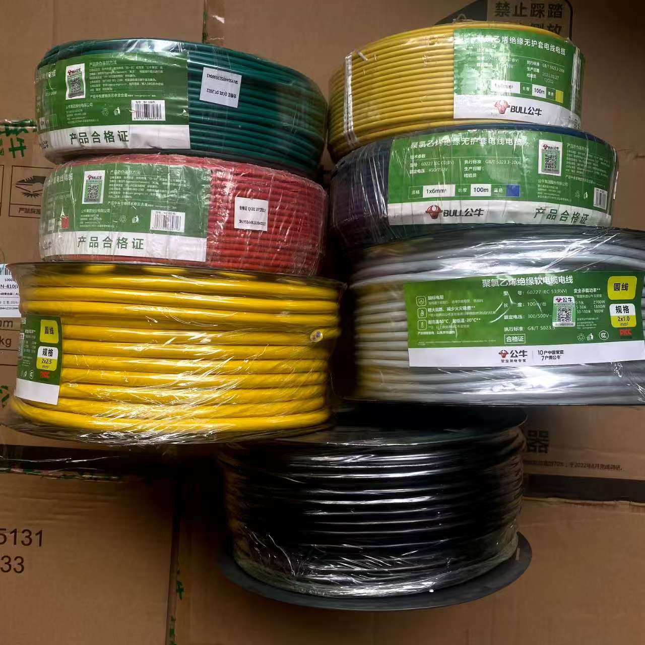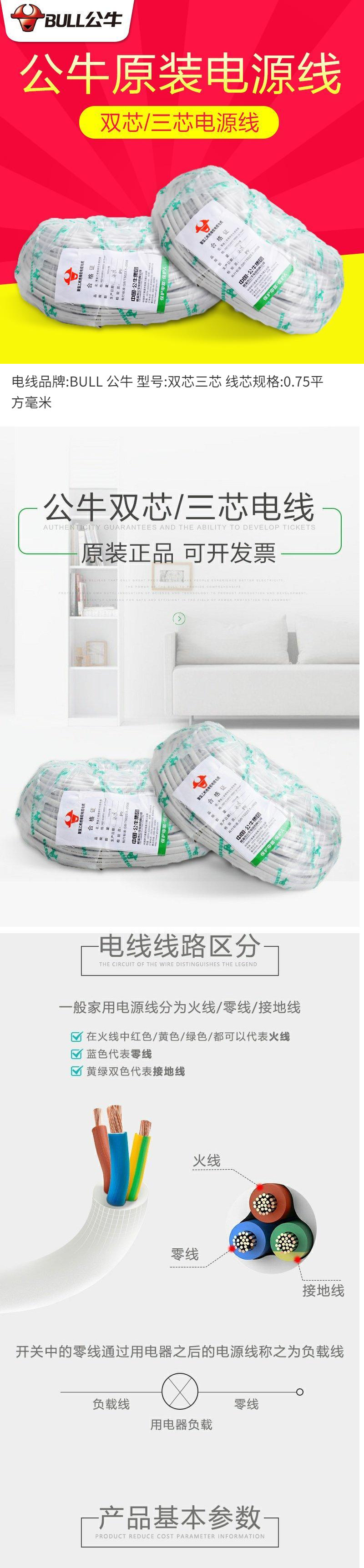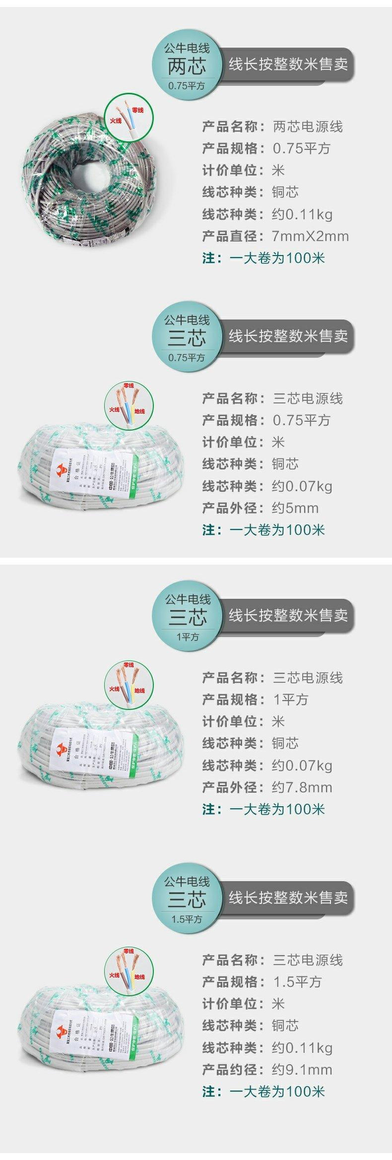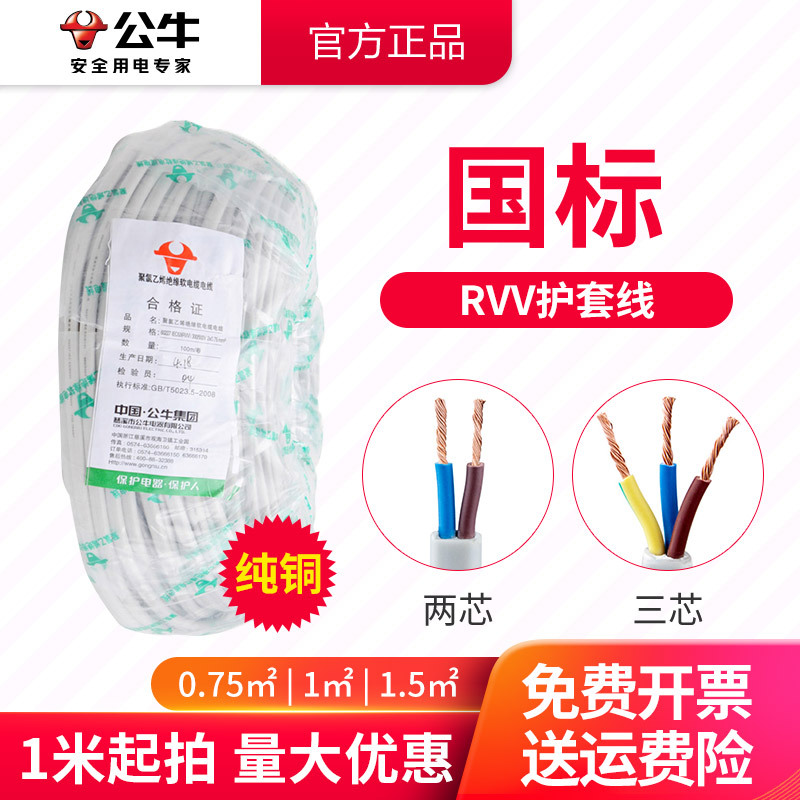雄牛国標保護カバー線卸売りrvv両芯3芯1 1.5平方家庭用コード防水電線電源コード