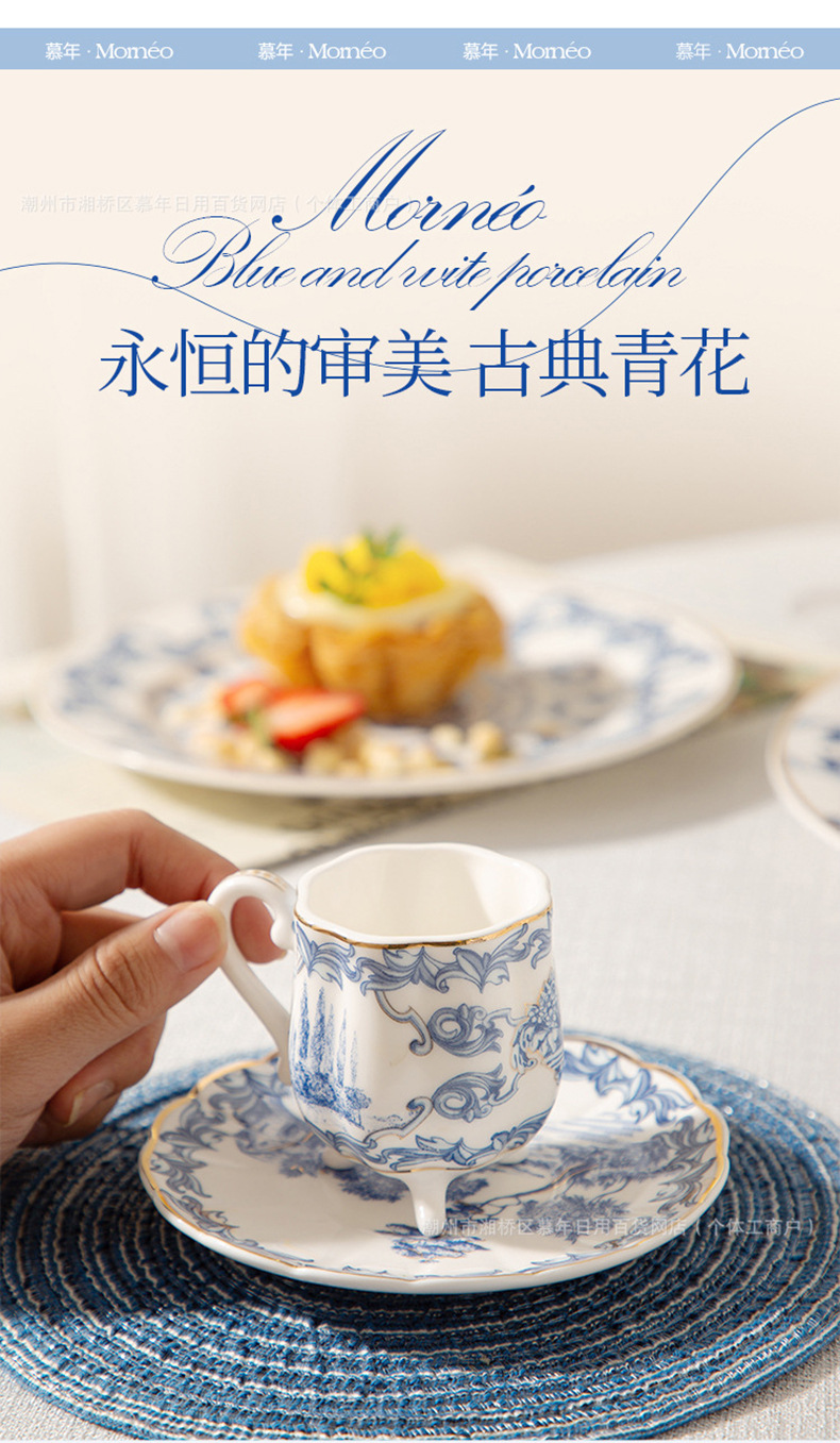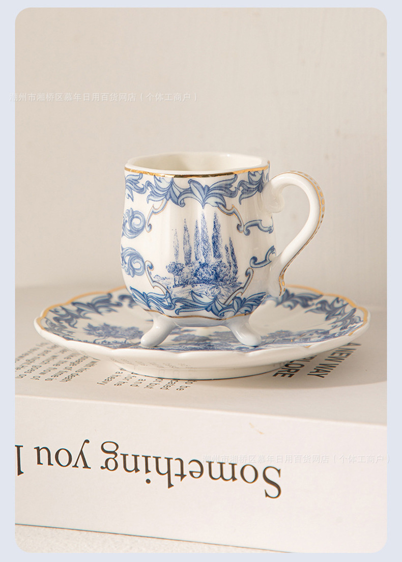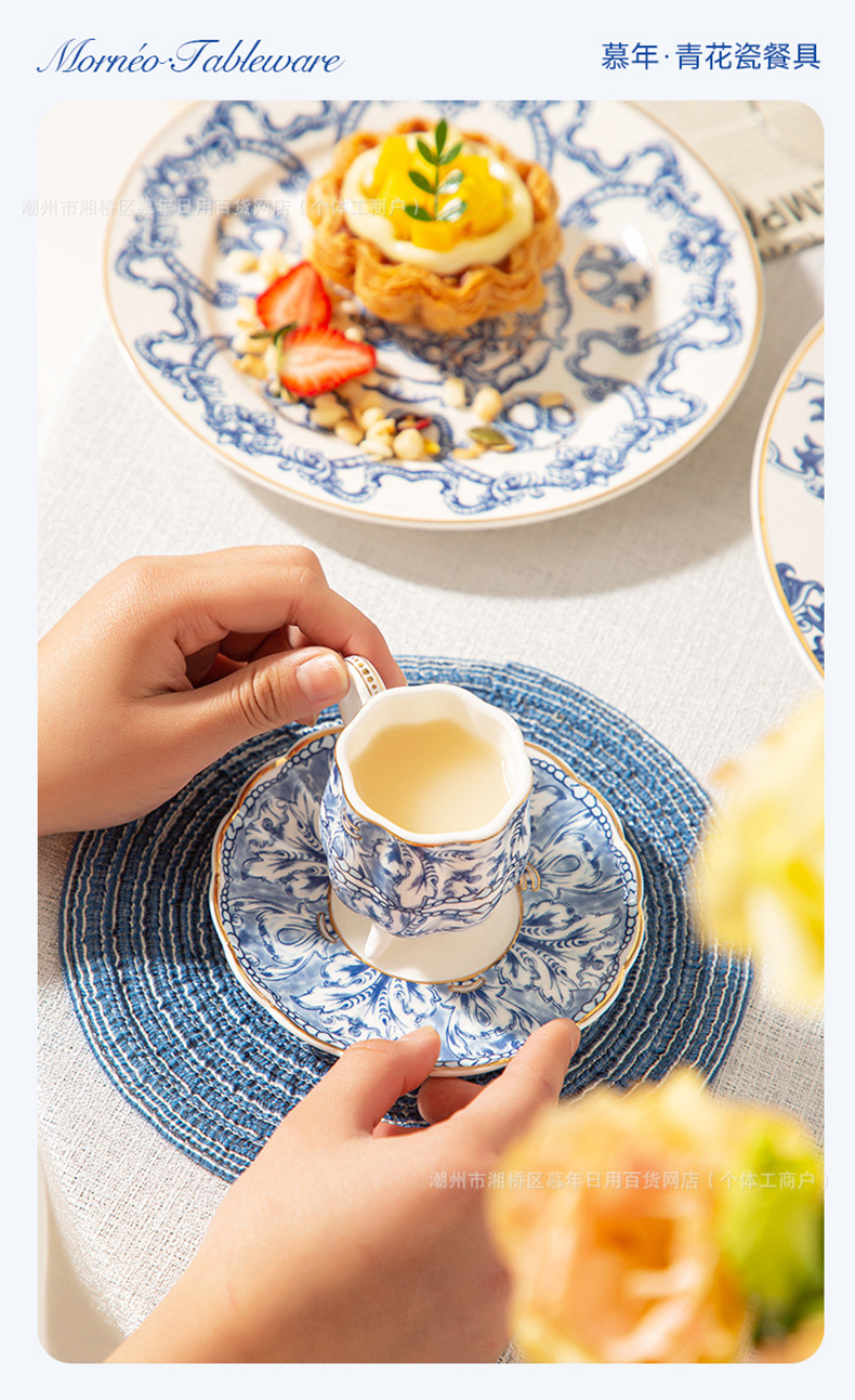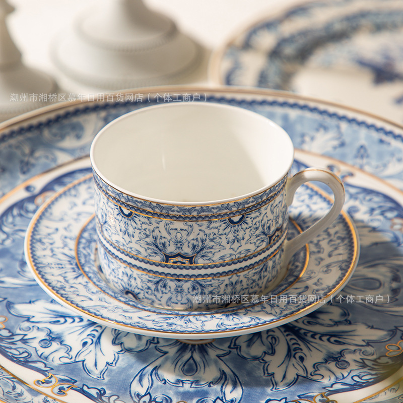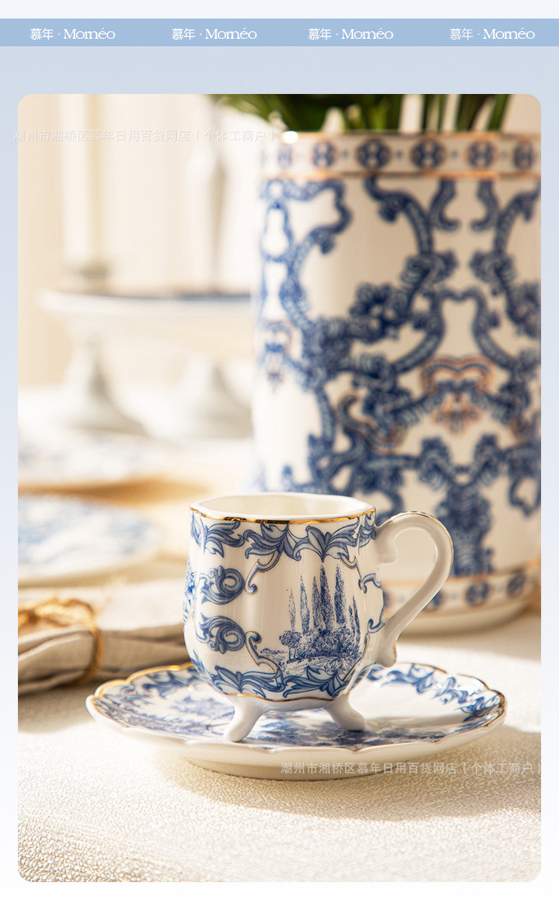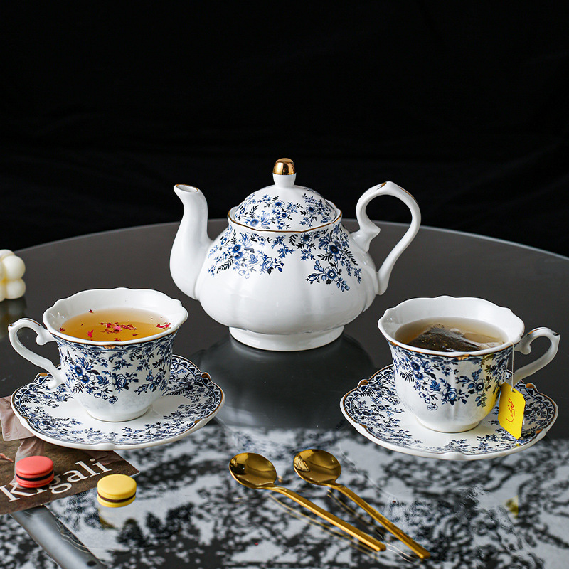 海外向け英国風青花磁器コーヒーカップ&ソーサーセット、セラミックレトロヨーロピアンスタイル、軽贅沢アフタヌーンティーカップ&ティーポット