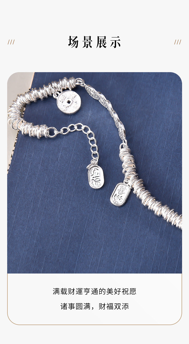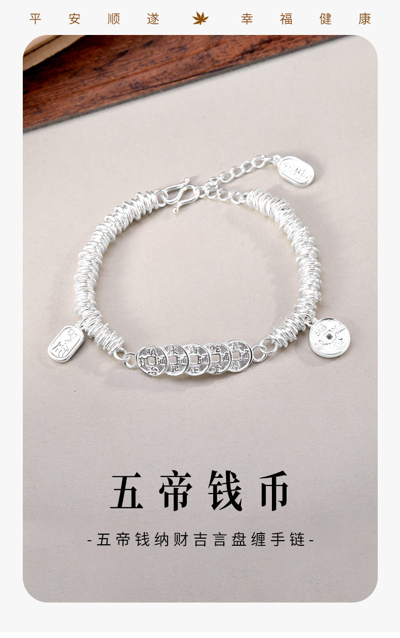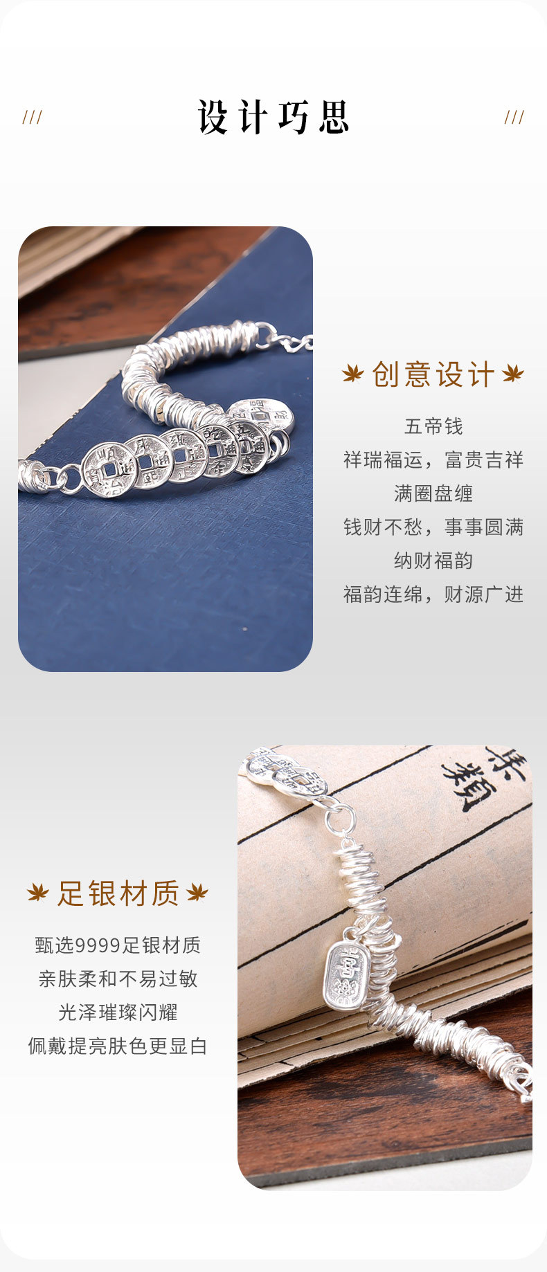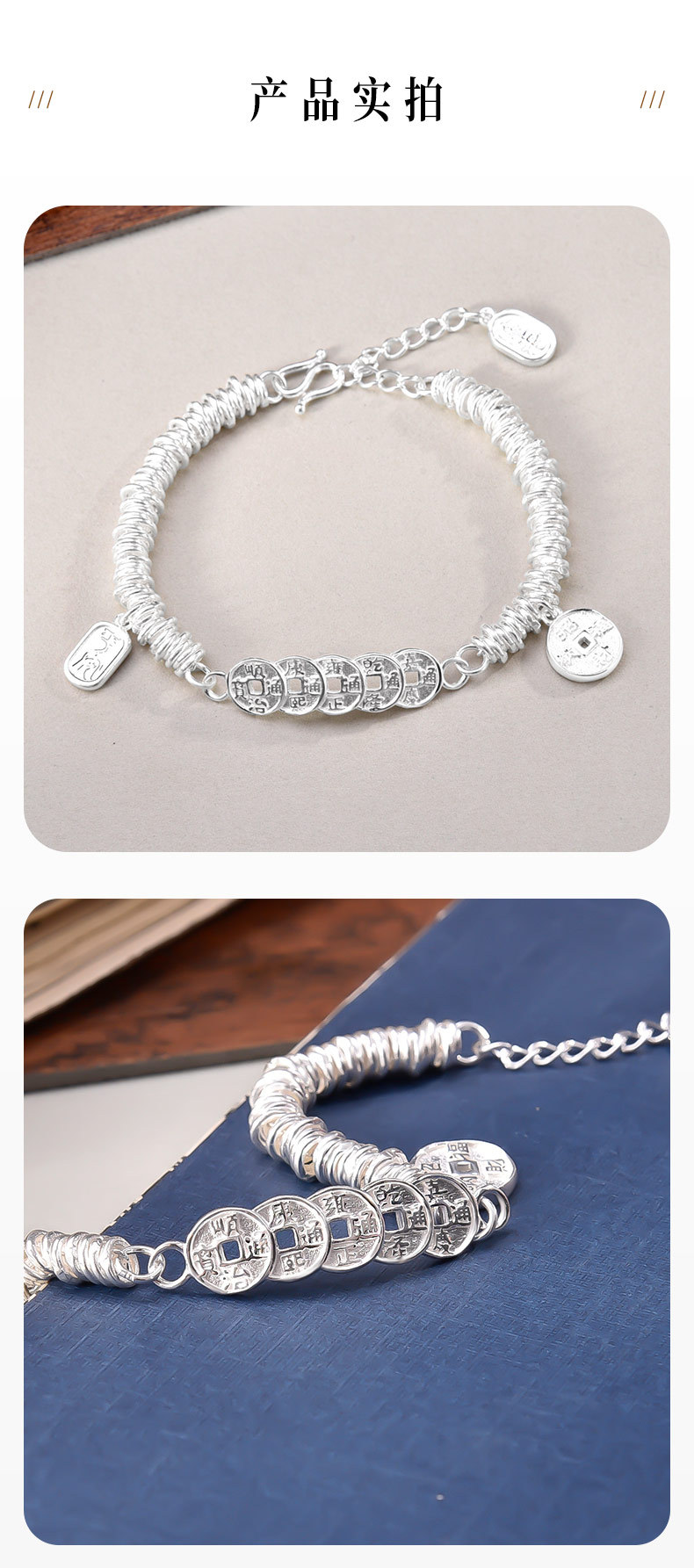 9999纯银五帝钱碎银手链男女新中式平安铜钱足银盘缠手串银饰批发