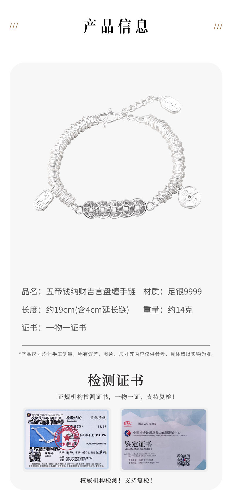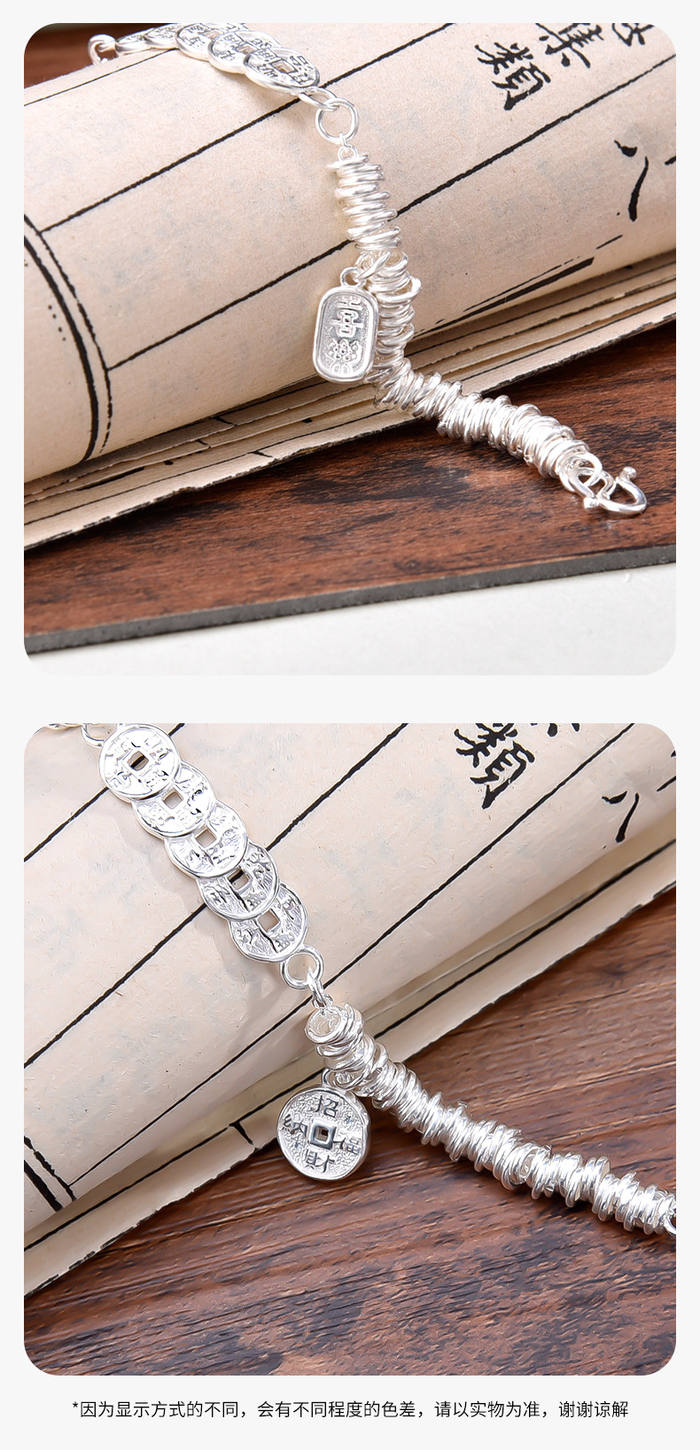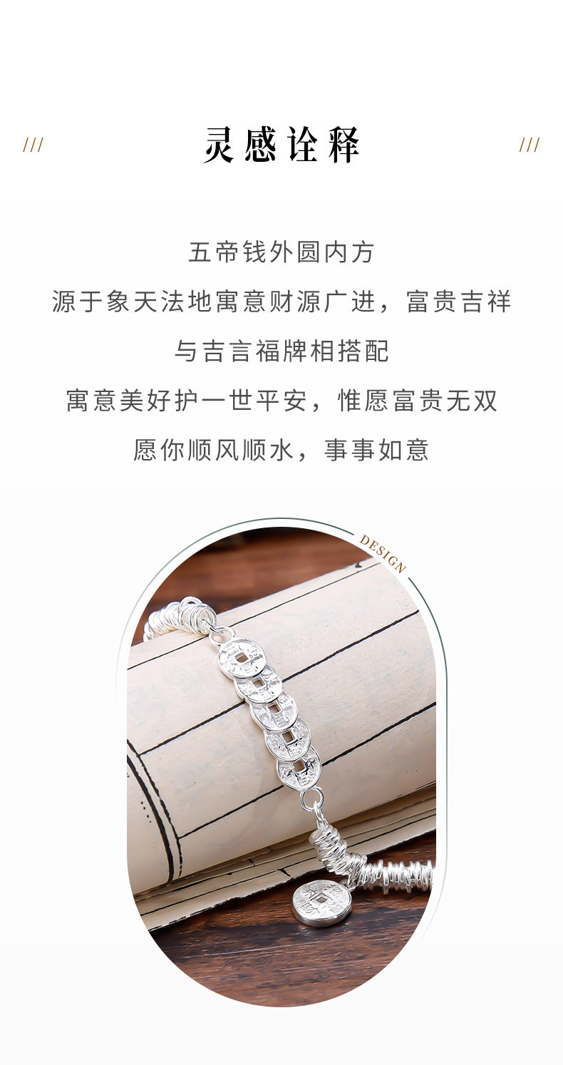 9999纯银五帝钱碎银手链男女新中式平安铜钱足银盘缠手串银饰批发