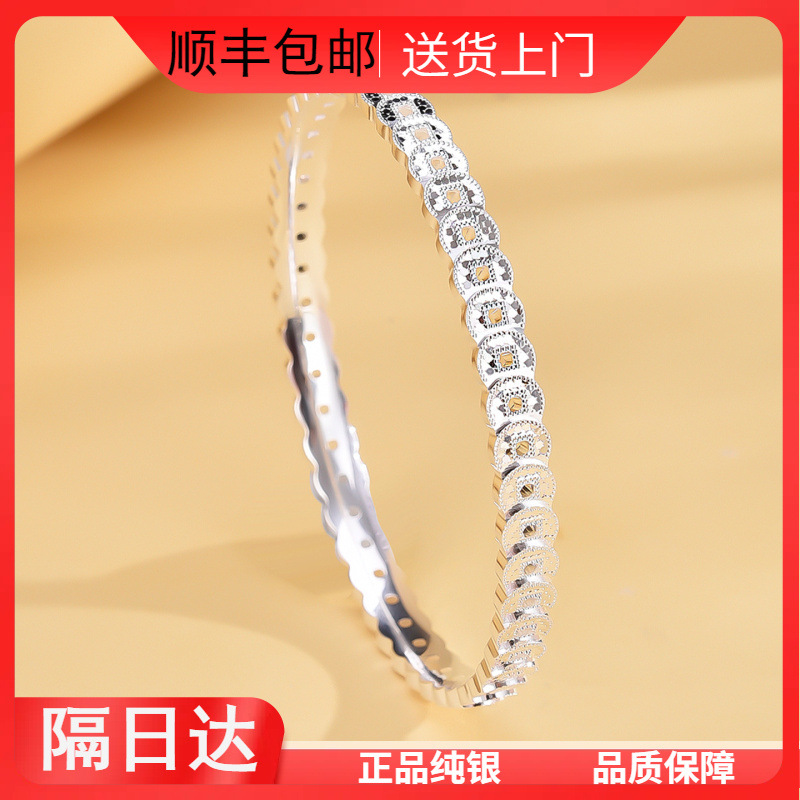 9999纯银碎冰冰铜钱手镯女士原创新款国风闭口足银镯子七夕节礼物