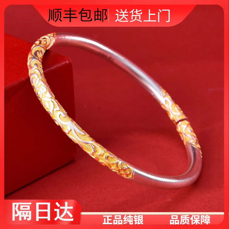 批发足银9999纯银手镯女男古法描金唐草纹银镯子银饰店开店货品
