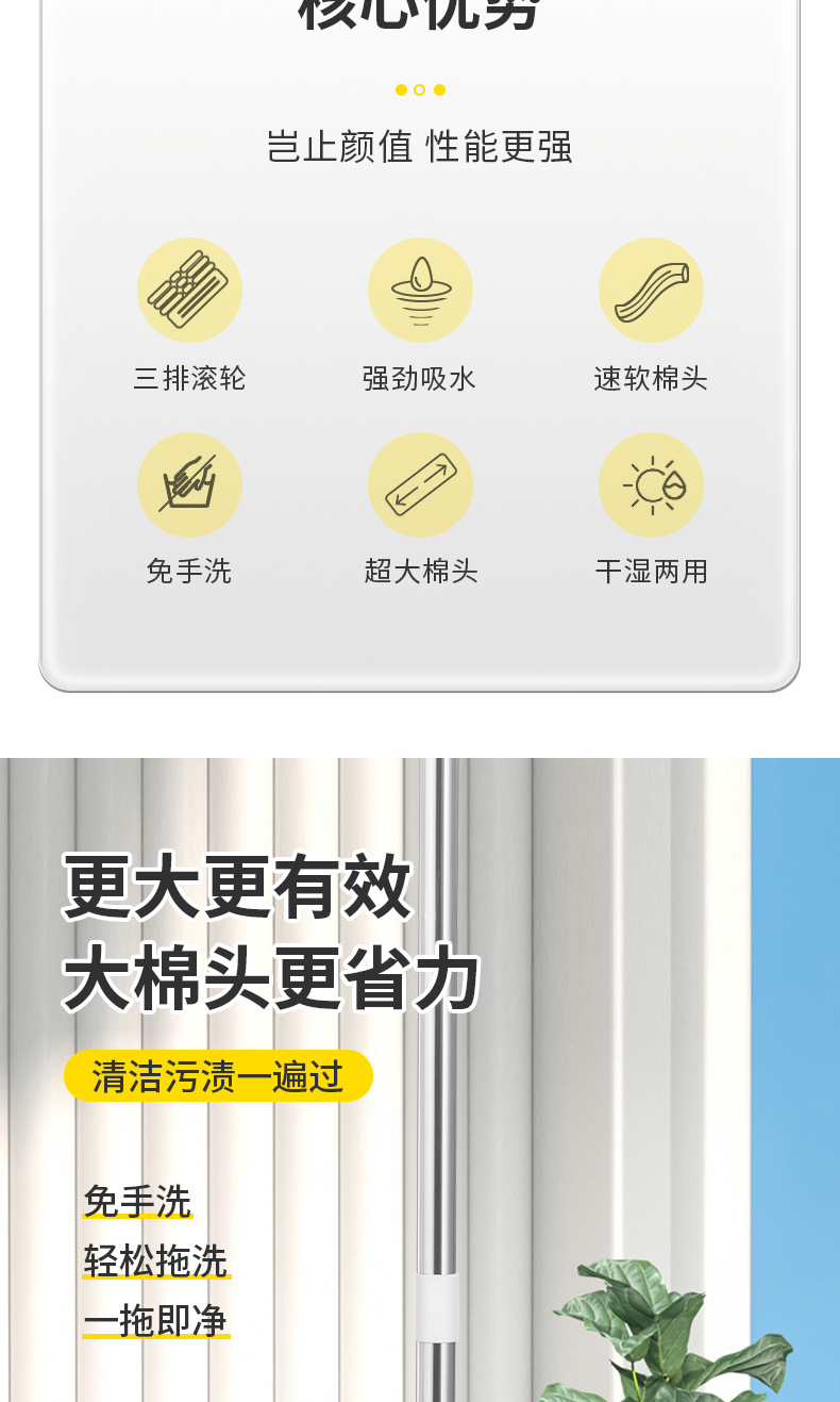 モップスポンジモップ家庭用ローラー式絞り水ハンドフリー洗えるコットンモップ大型モップ吸水軽量ワンモップ