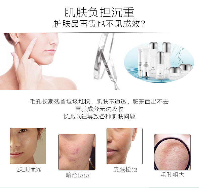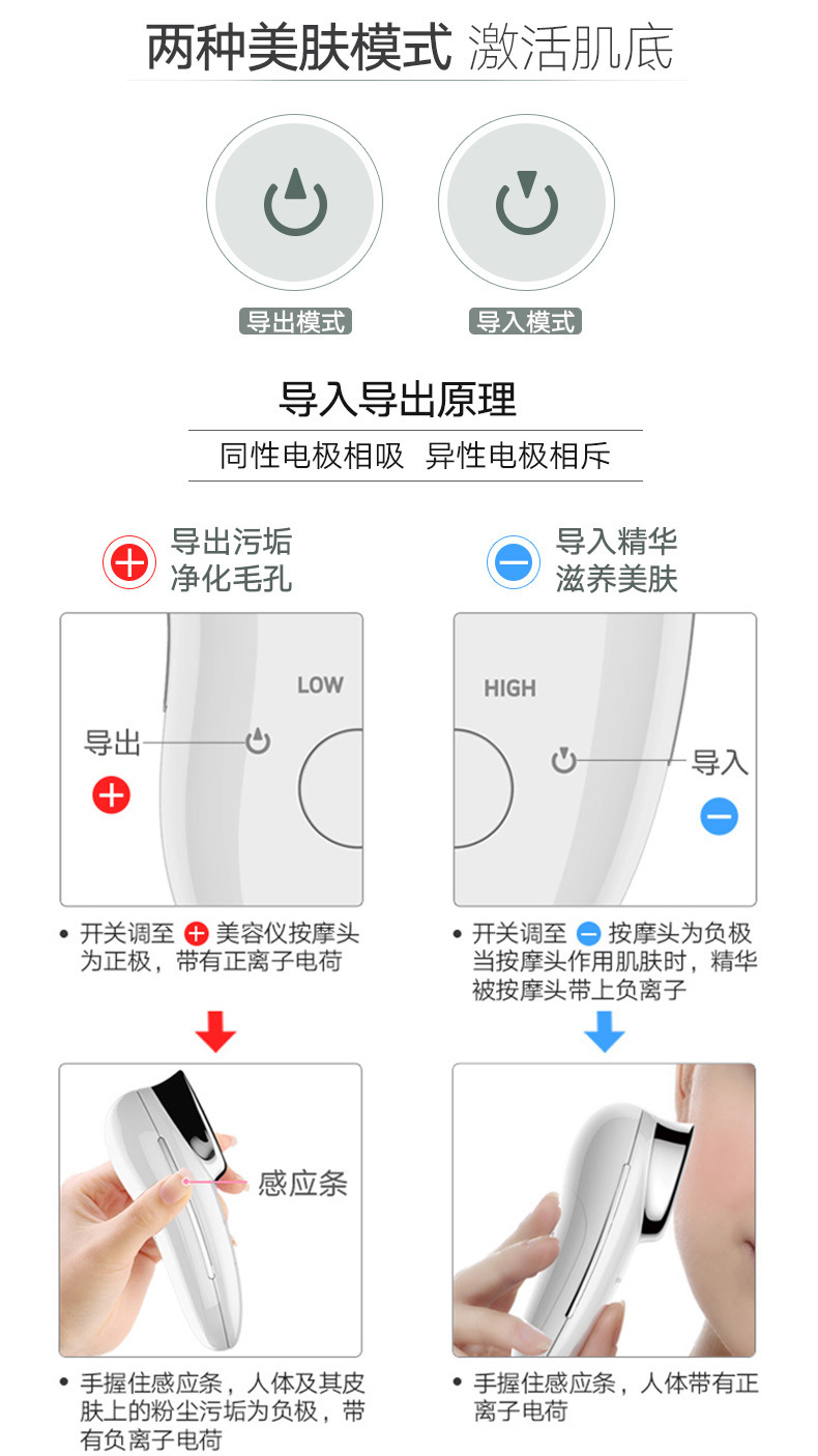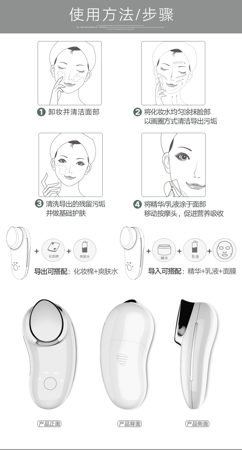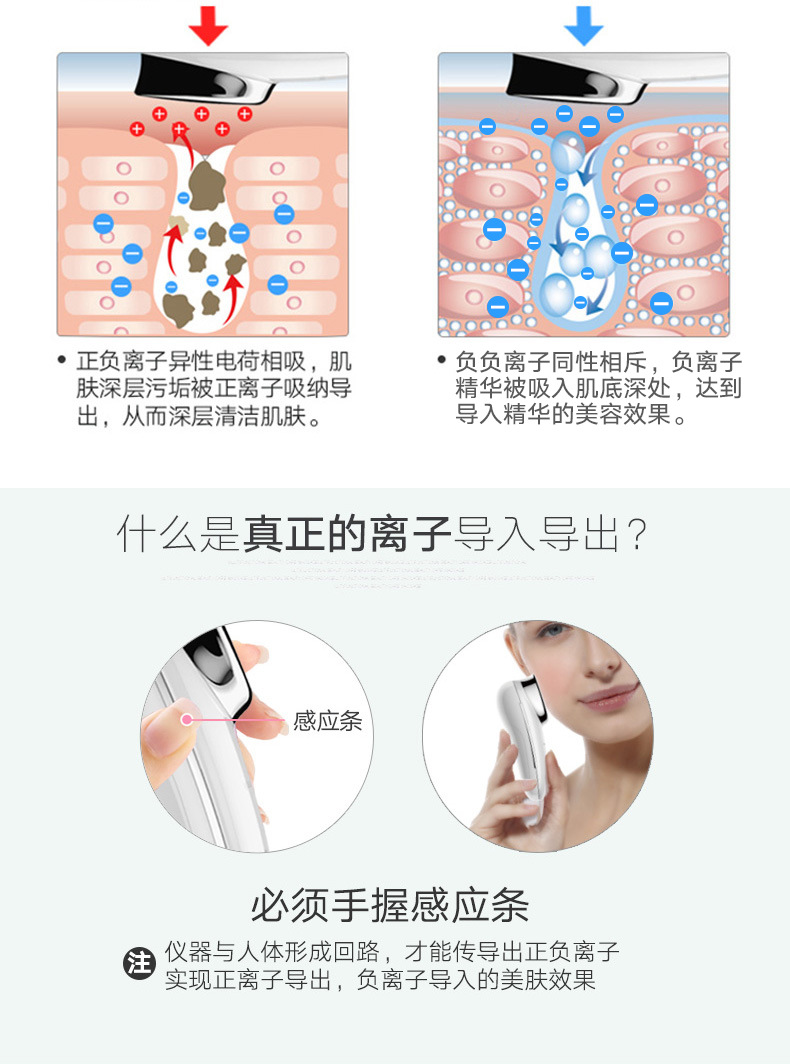 1、正离子导出搭配声波震动,有效清洁毛孔内脏污及化妆品残留