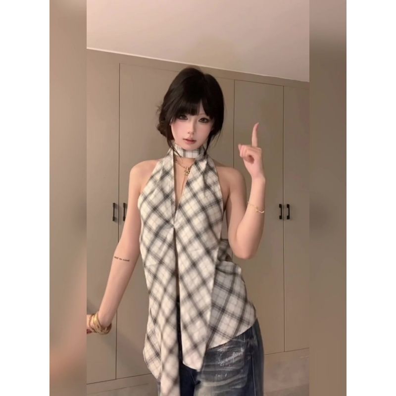 ファッショナブルでセクシーなチェック柄ステッチバックレスキャミソールレディース夏ホットガールスタイルスリムフィット多用途へそ出しトップ