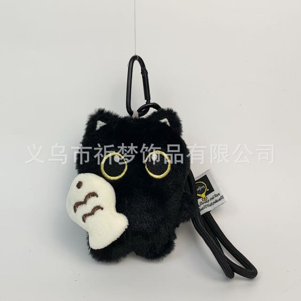可爱呆萌抱小鱼大眼黑猫挂件毛绒玩偶情侣包挂件创意小黑猫钥匙扣