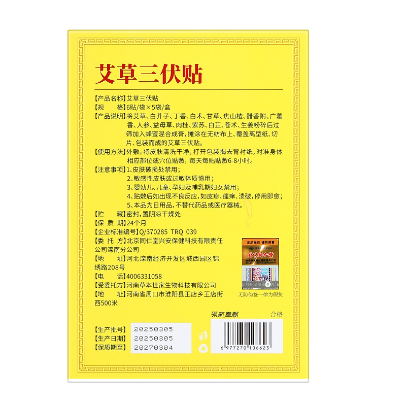北京銅仁堂内廷ヨモギサンフパッチ 6パッチ/袋×5袋/箱