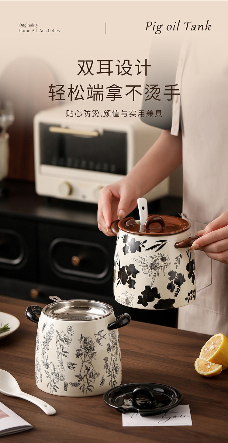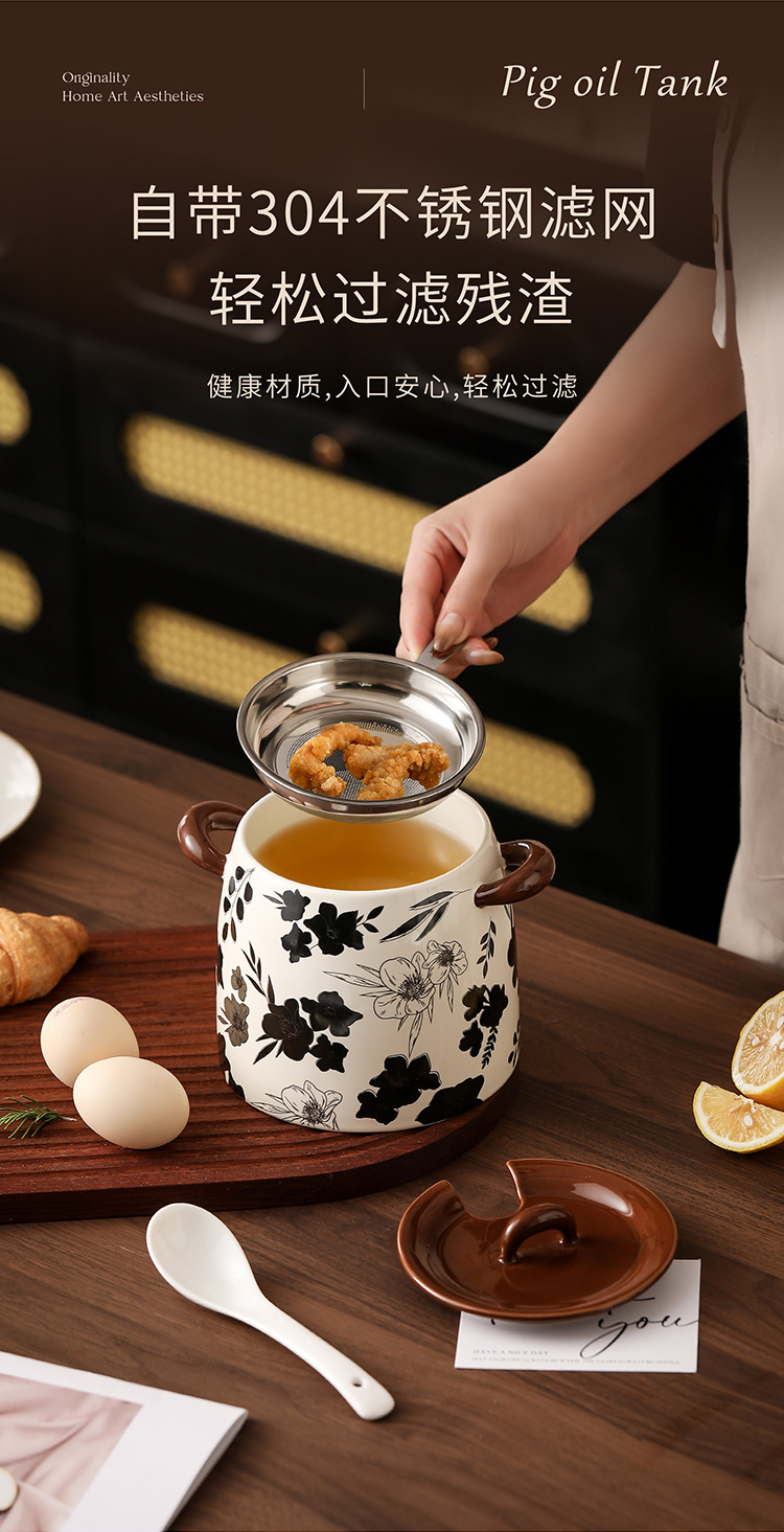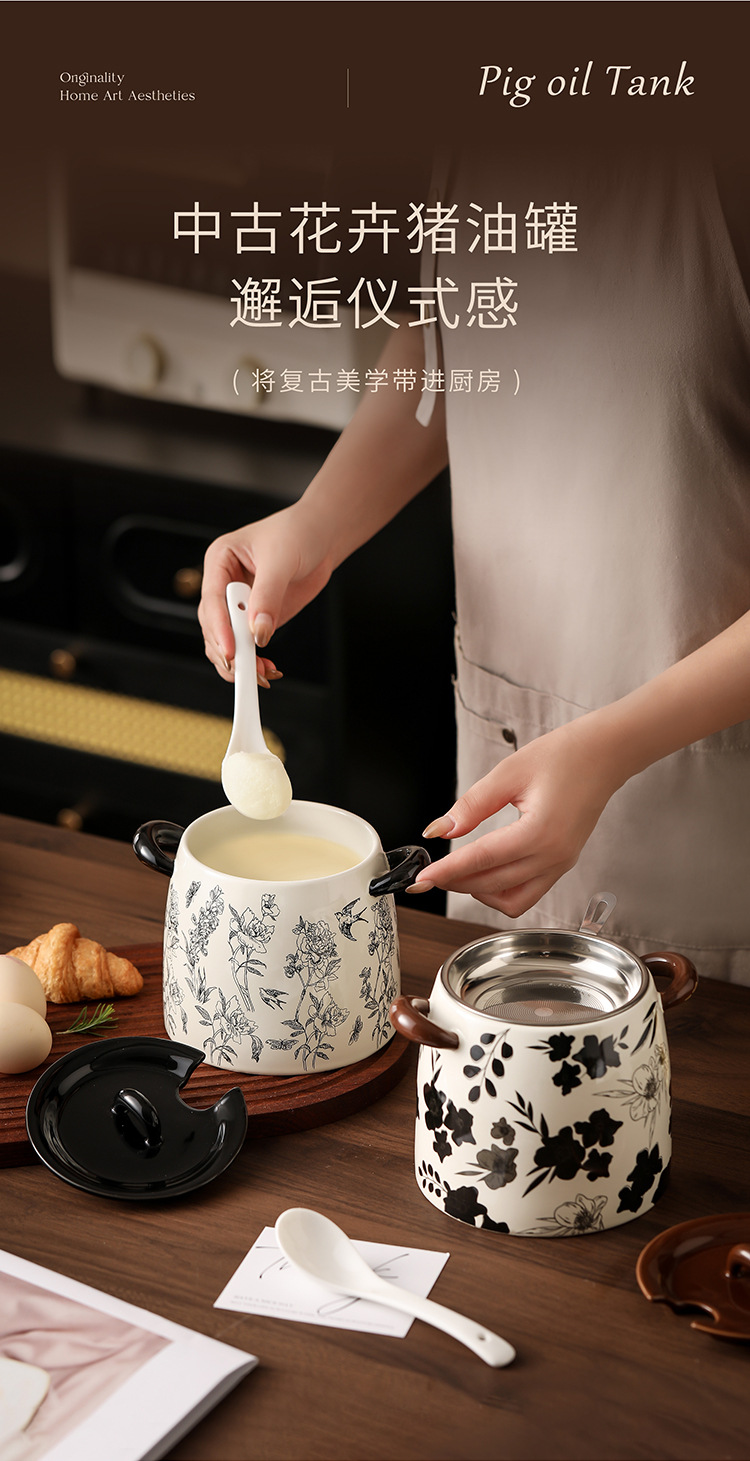 猪油罐家用可放冰箱复古大容量猪油罐带勺带滤网陶瓷猪油罐食品级