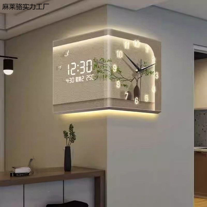 新しいクリエイティブライト高級ハイエンドコーナー両面壁時計シンプルでモダンなリビングルーム時計誘導デジタルディスプレイサイレント時計