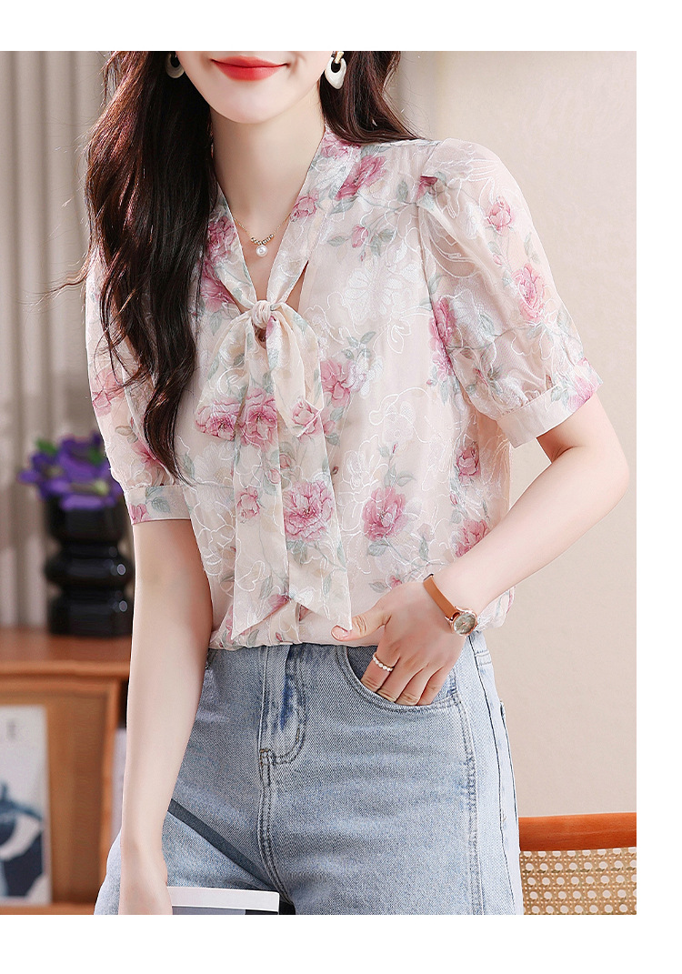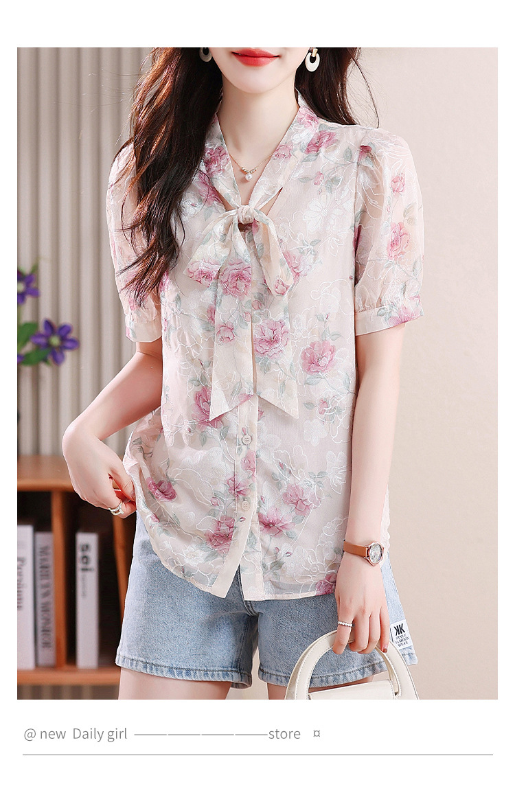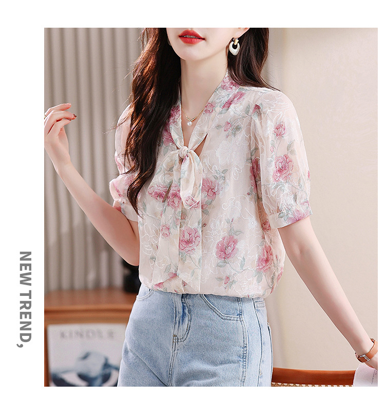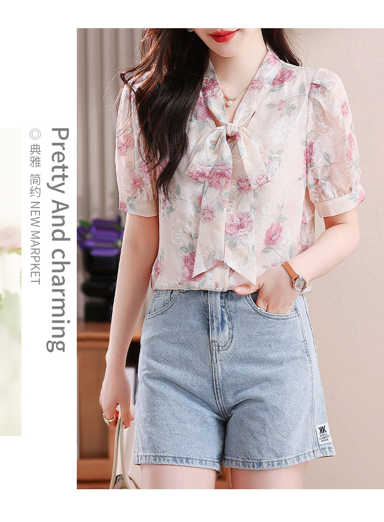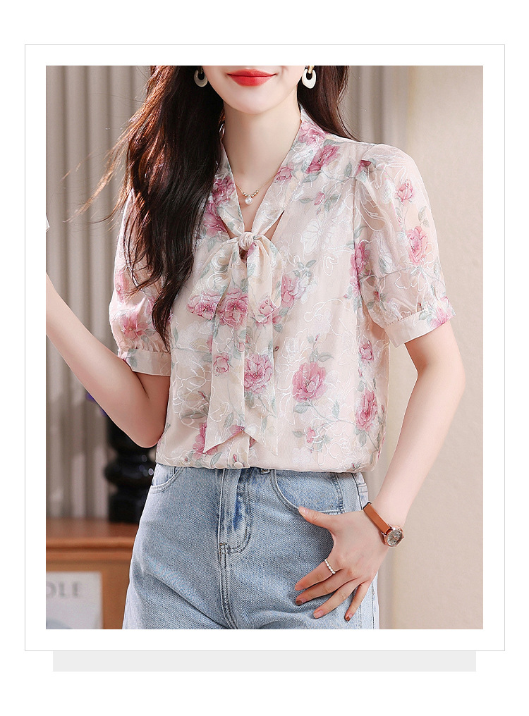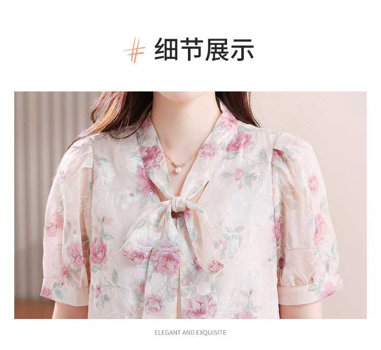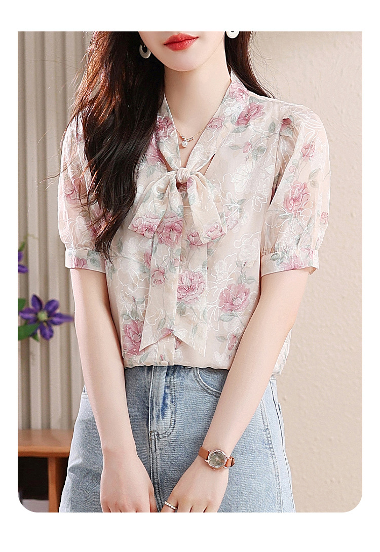 hmwl9960 パフスリーブフレンチシャツ女性のための 2025 夏の新しいスタイルのリボン刺繍半袖シフォントップ