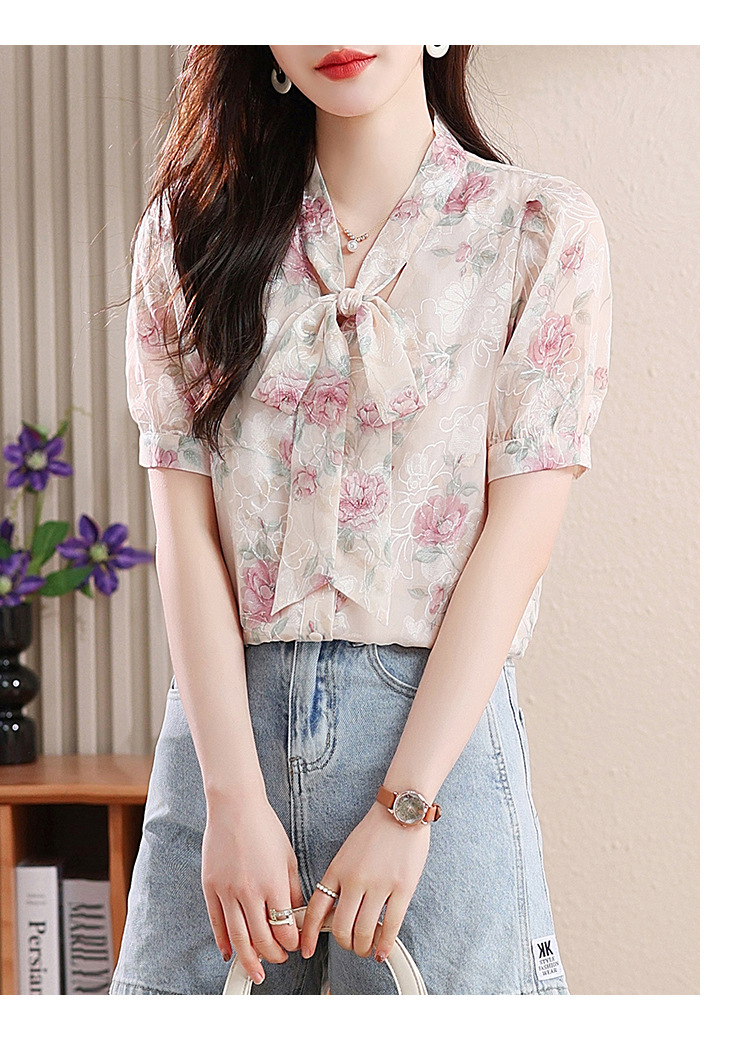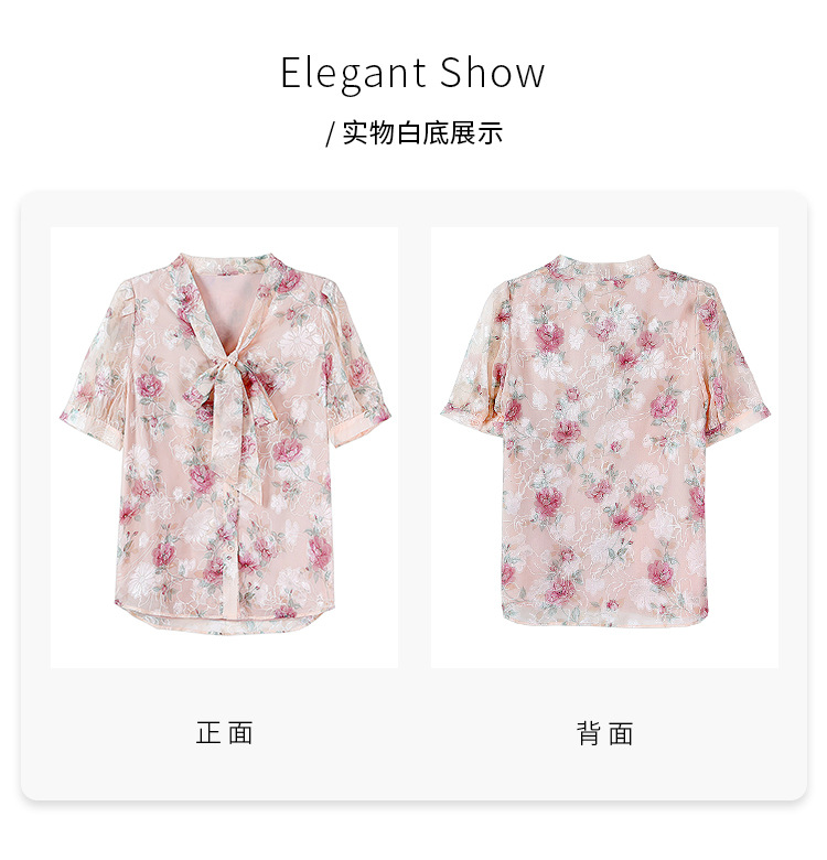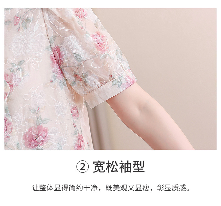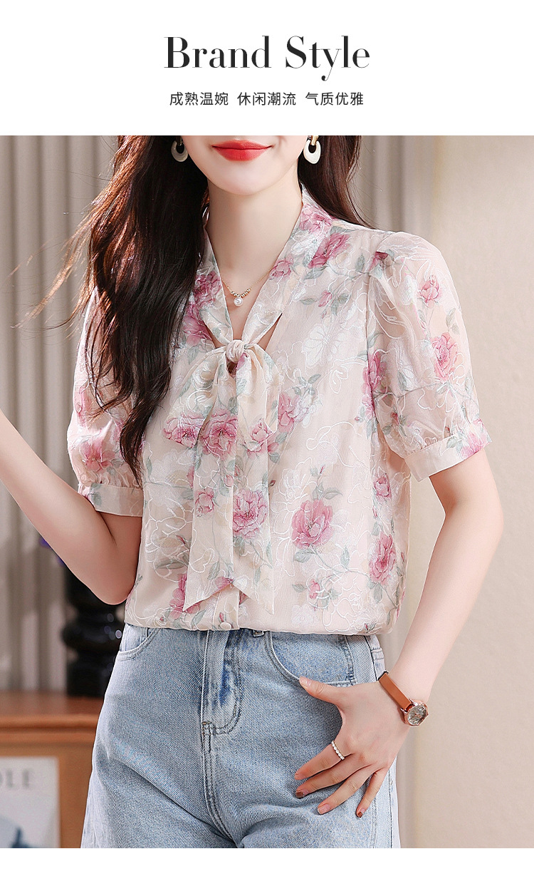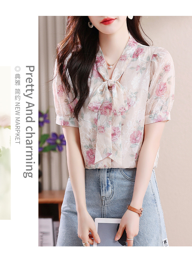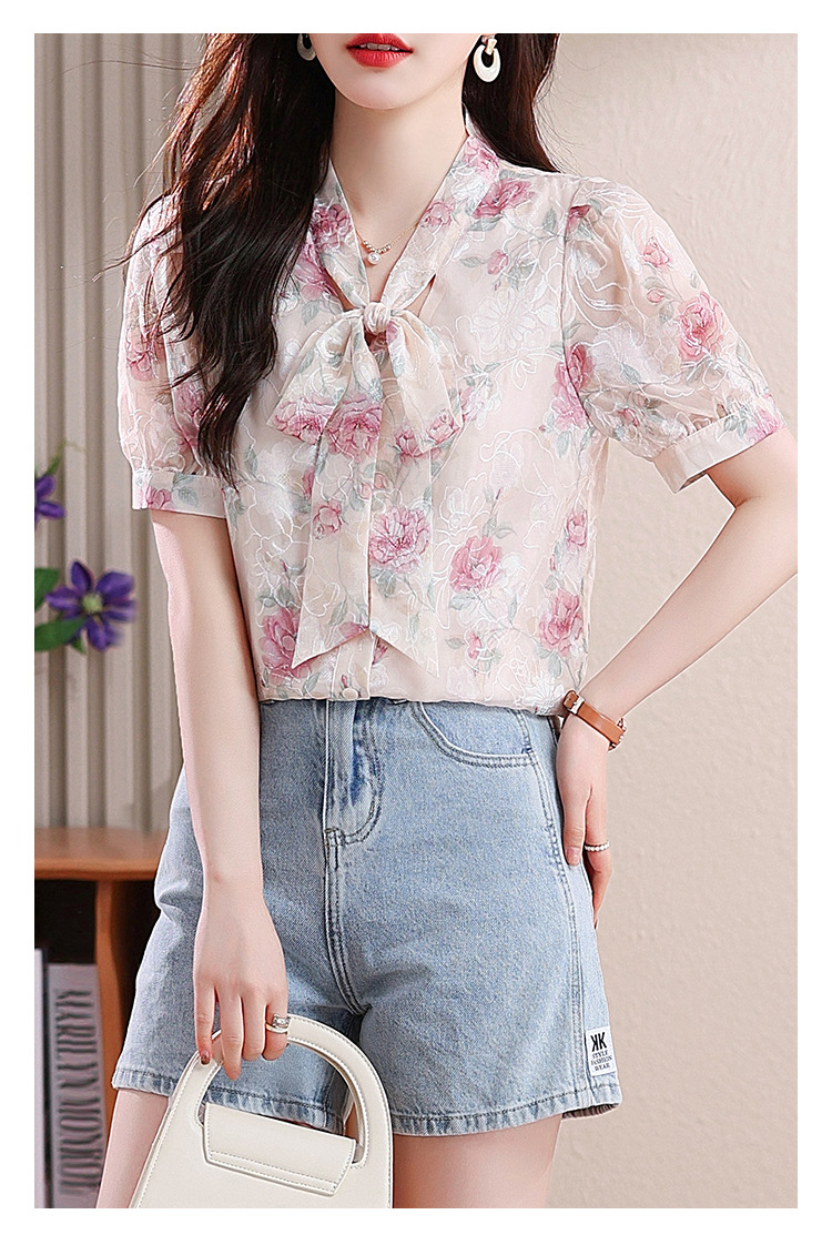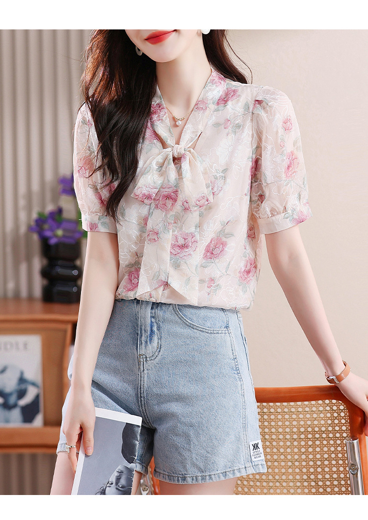 hmwl9960 パフスリーブフレンチシャツ女性のための 2025 夏の新しいスタイルのリボン刺繍半袖シフォントップ
