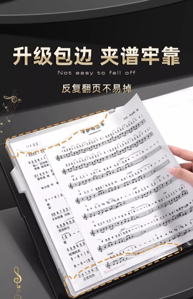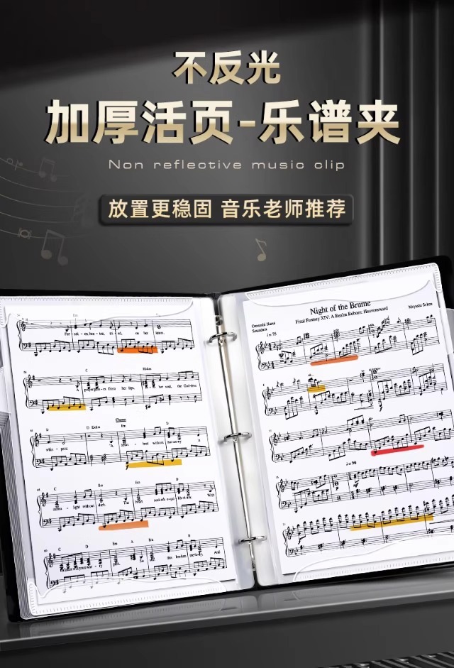 ピアノスコアクリップ、楽譜収納ブック、黒の楽譜ブック、透明インサートスコアクリップ、無反射スコアクリップ