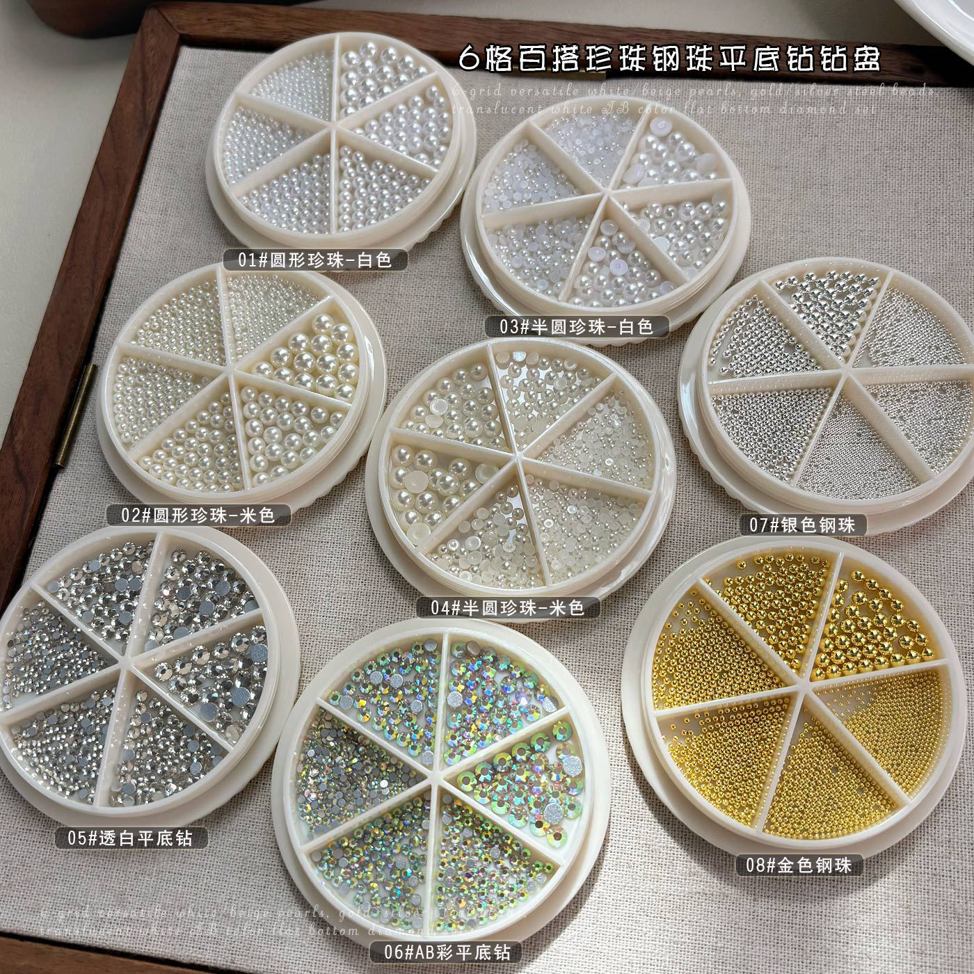 跨境爆款6格珍珠美甲饰品套盒纯白米白圆形小钢珠平底水钻diy配饰