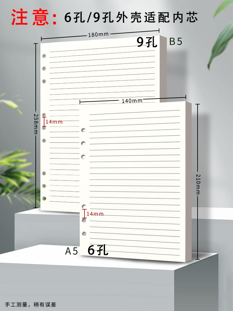 6/9穴ルーズリーフリフィル取り外し可能なb5ノートブックインナーコアa5水平線正方形空白ルーズリーフ紙インナーページ