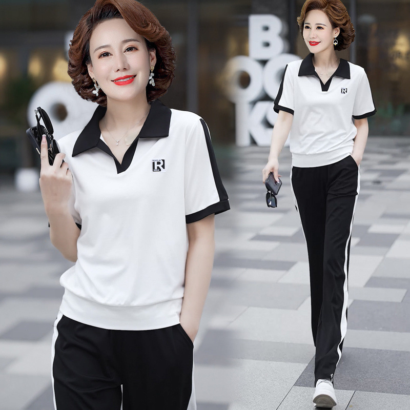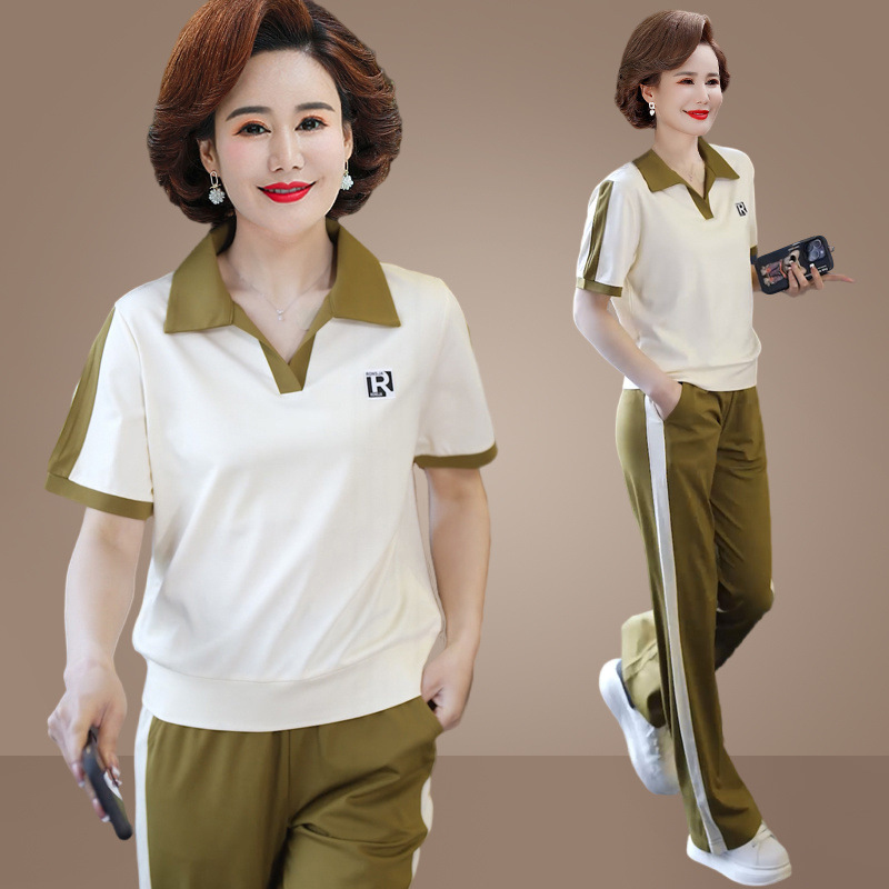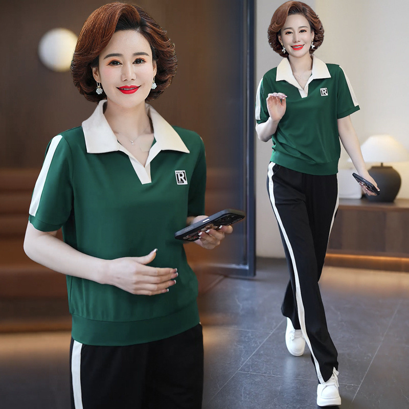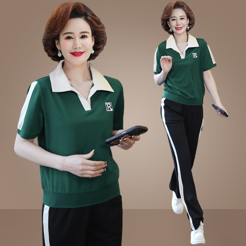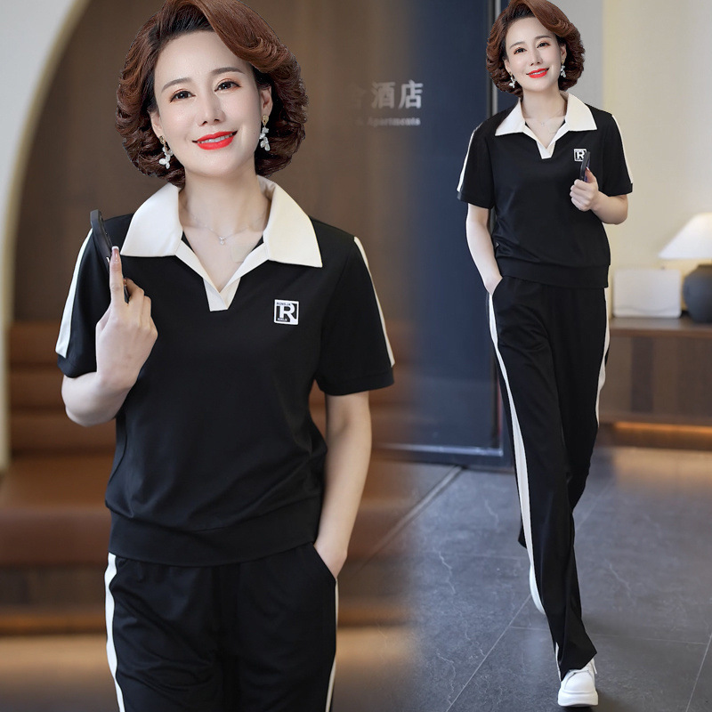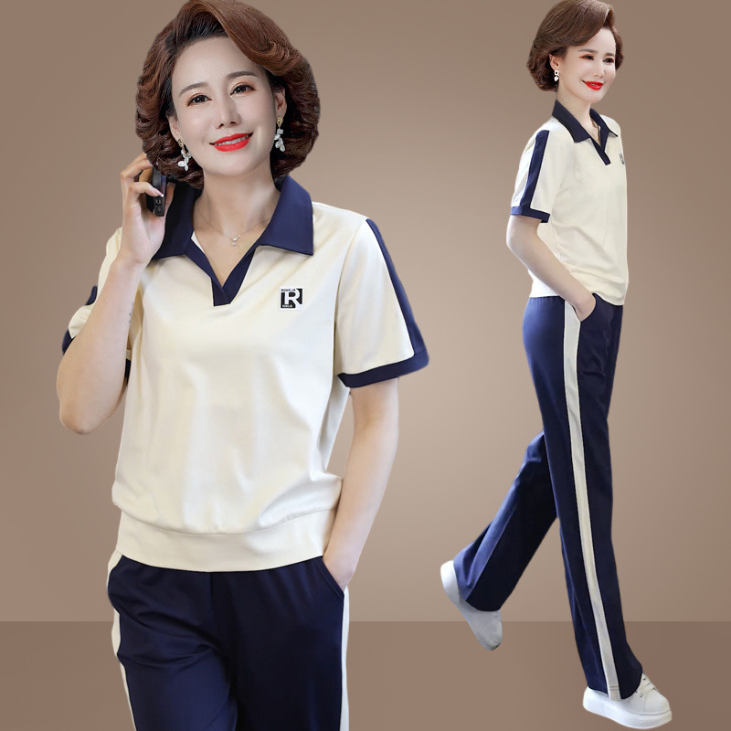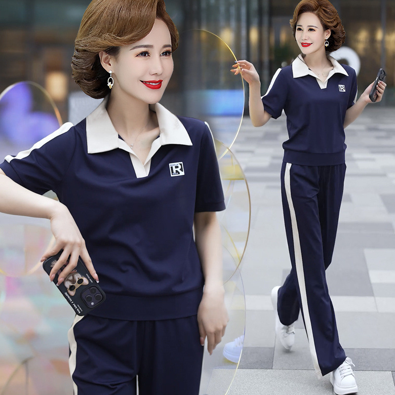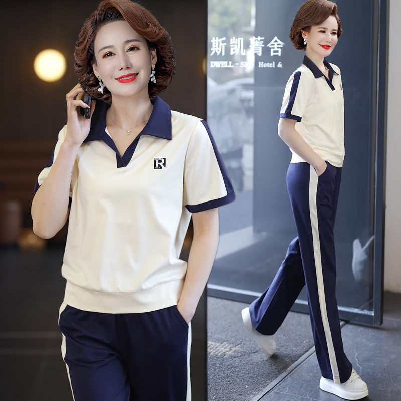 洋風ママ夏の新作スポーツスーツ中年女性の有名ブランドファッション半袖トップスカラーブロックTシャツ