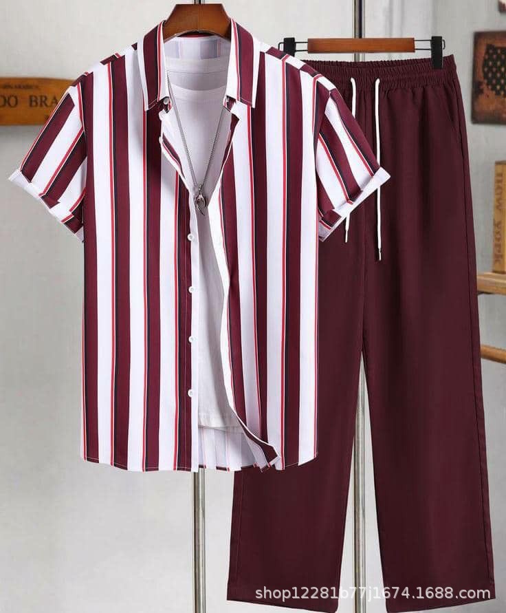 2025条纹格子男士套装夏季短袖长裤休闲2025年新款透气时尚