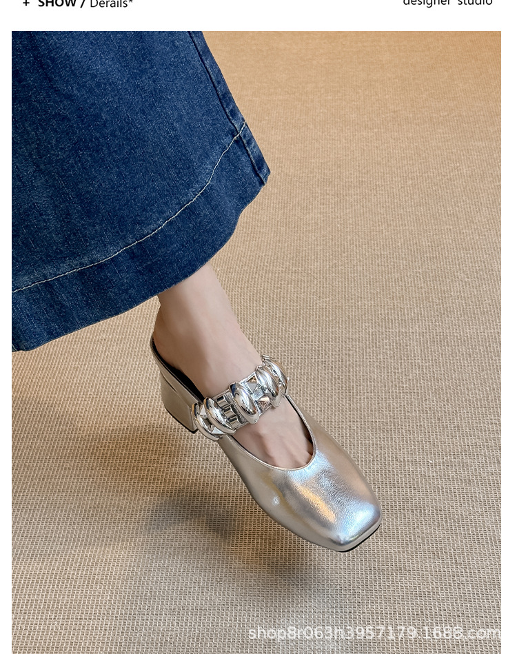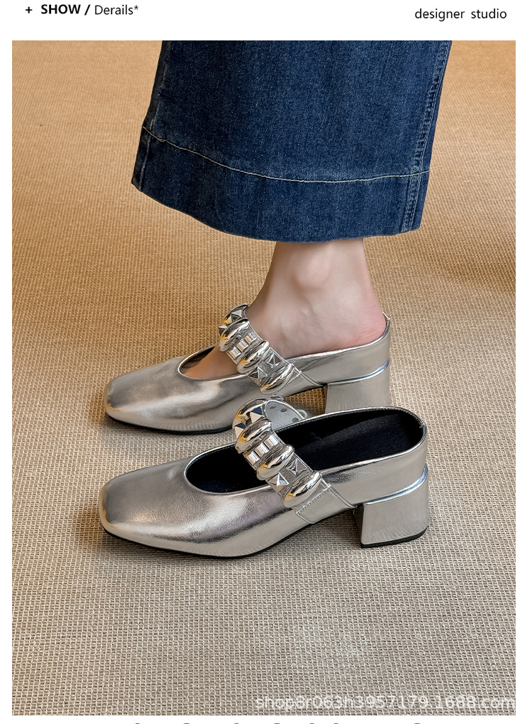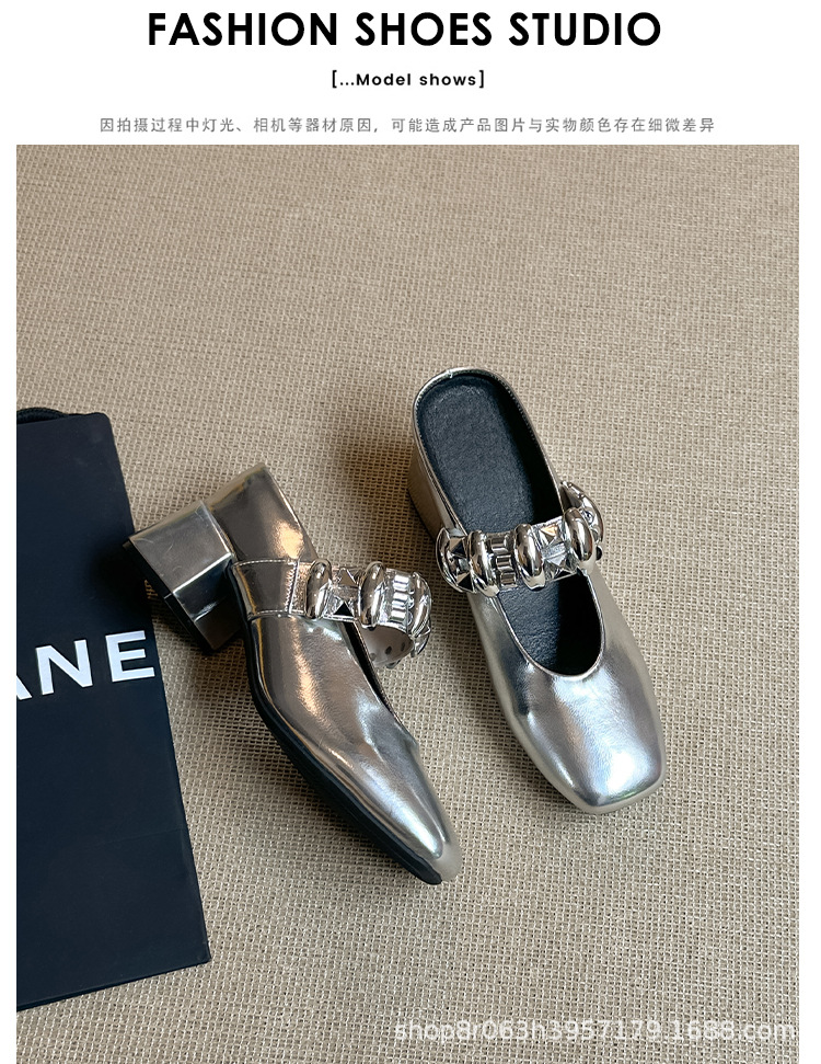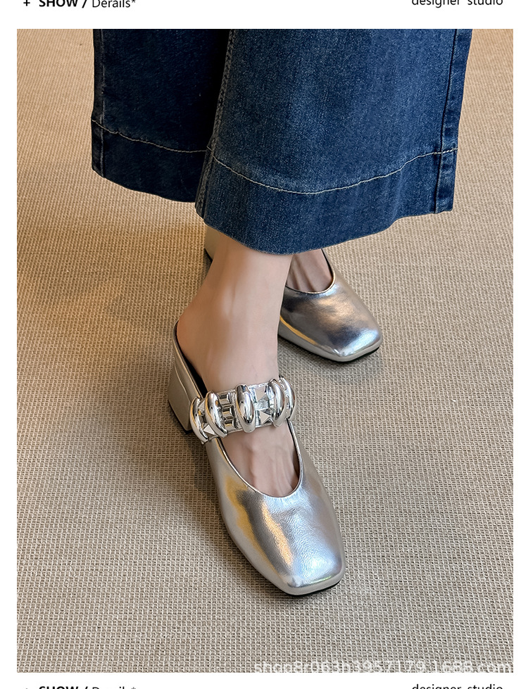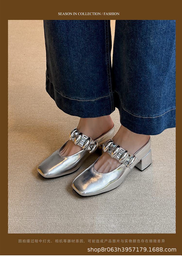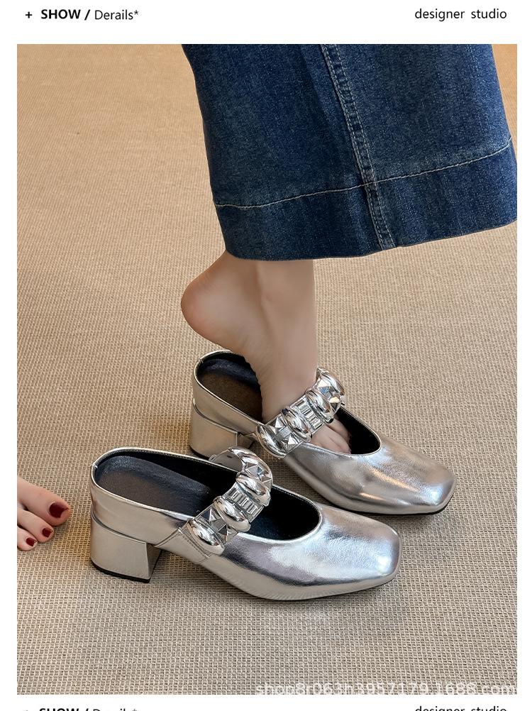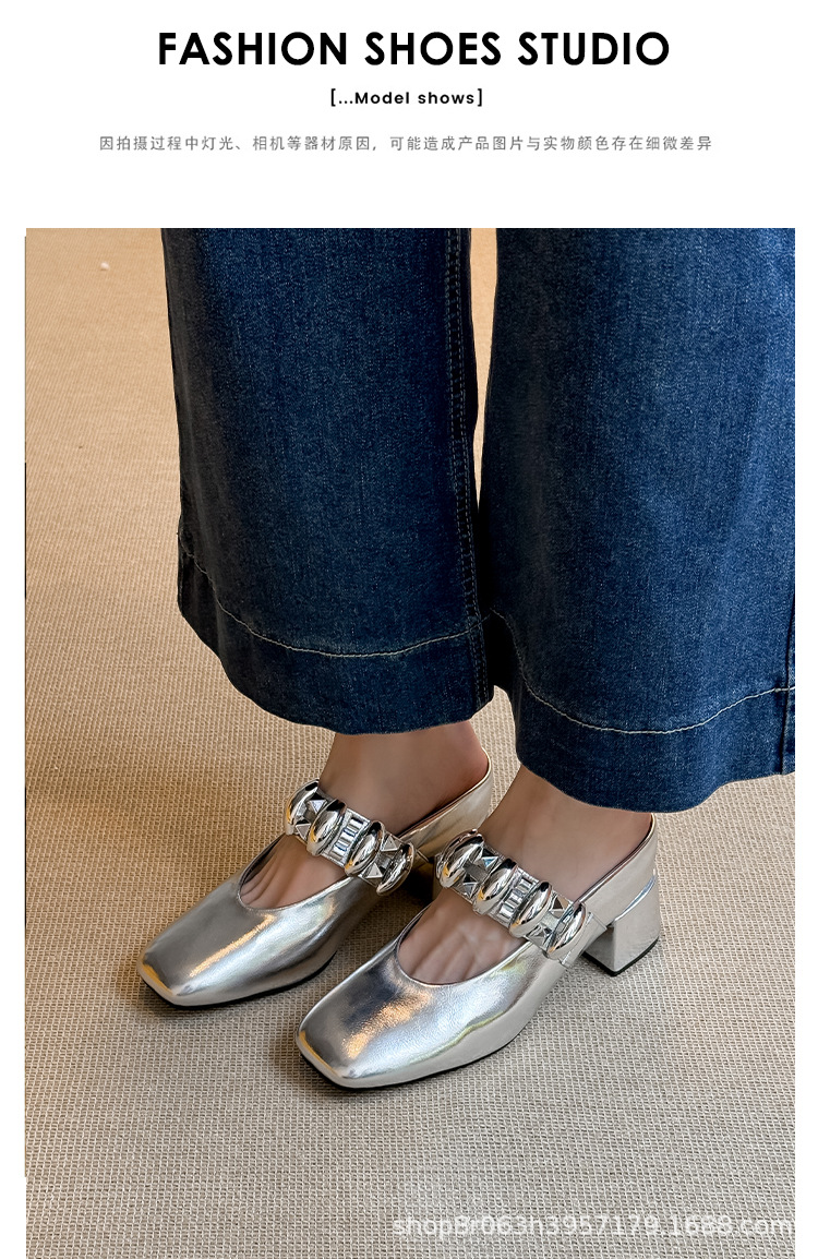 包頭ハーフスリッパレディースハイヒール2025春夏新作シルバースクエアトゥ小柄インナー身長アップシューズメリージェーン