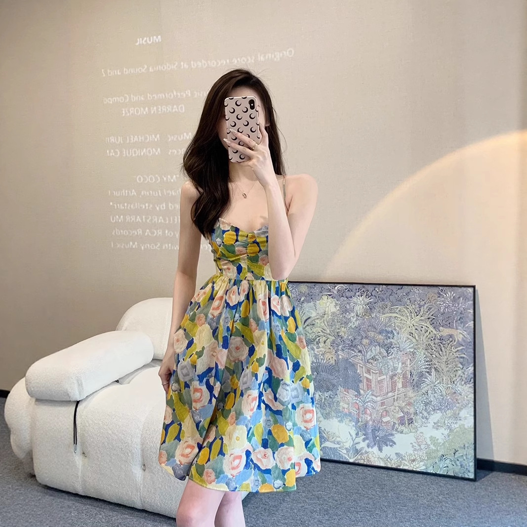 フレンチレトロ油絵初恋サスペンダースカート女性の夏の新しいハイエンド甘い気質ウエストホットガールドレス