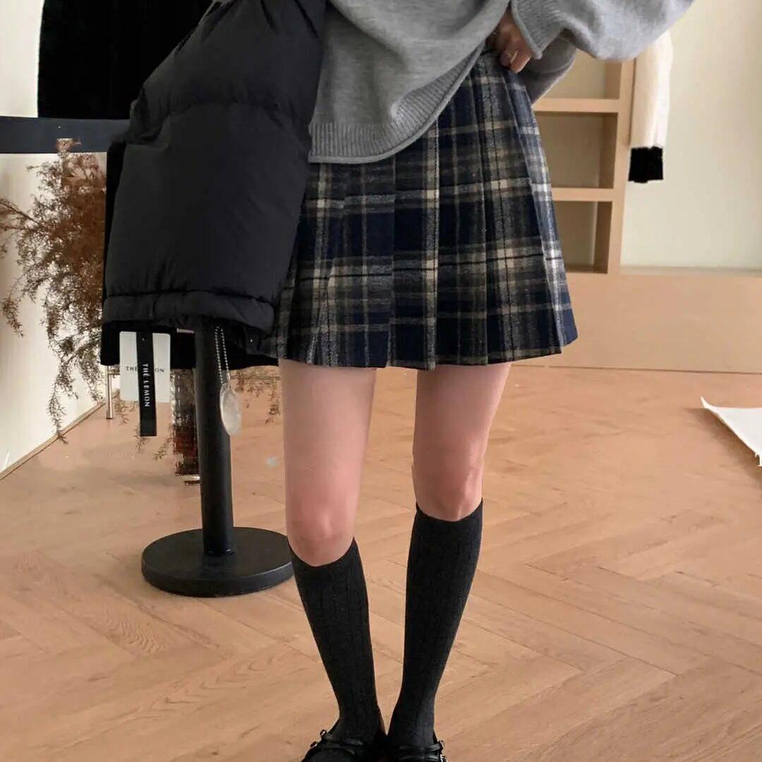 复古格子毛呢半身裙女秋季加厚防走光百褶裙高腰裙子格纹a字短裙