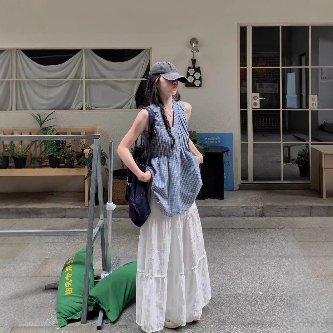 韓国チェック柄ベスト女性のための 2025 夏の新しい V ネックルーズカジュアルノースリーブトップは気質が良く見栄えします