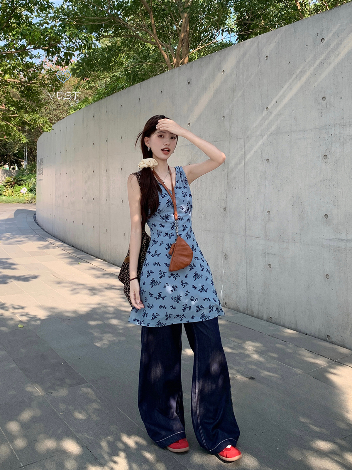 フレンチVネックノースリーブ花柄スカート小柄ブルードレスレディース夏ニッチスリムAラインスカート
