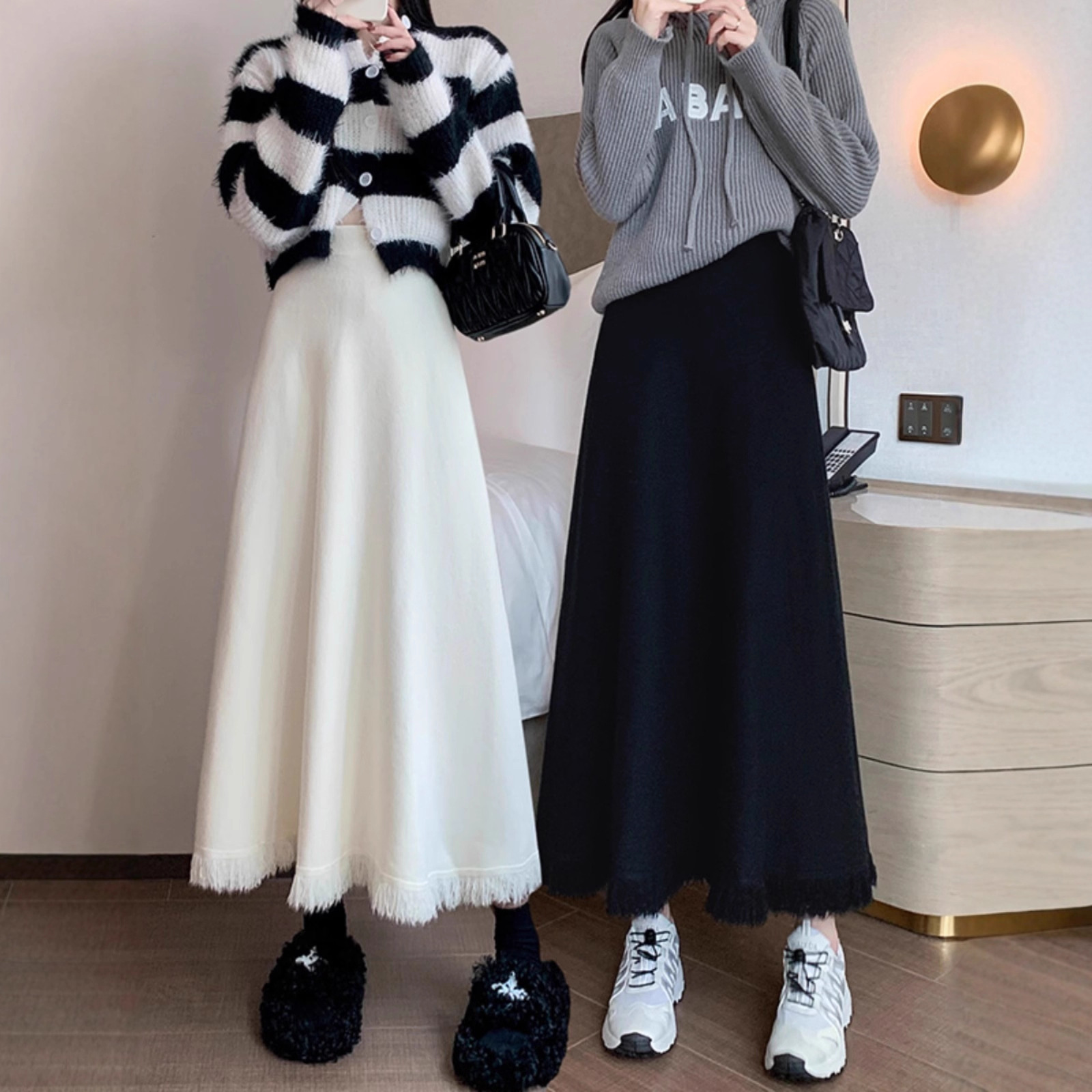 下摆流苏针织半身裙女秋冬小个子垂感大摆伞裙高腰中长款a字裙子