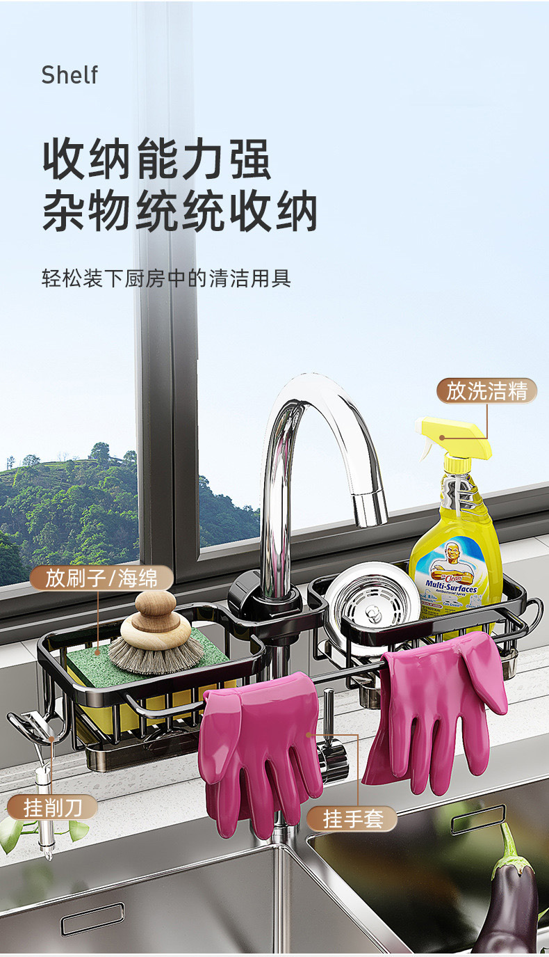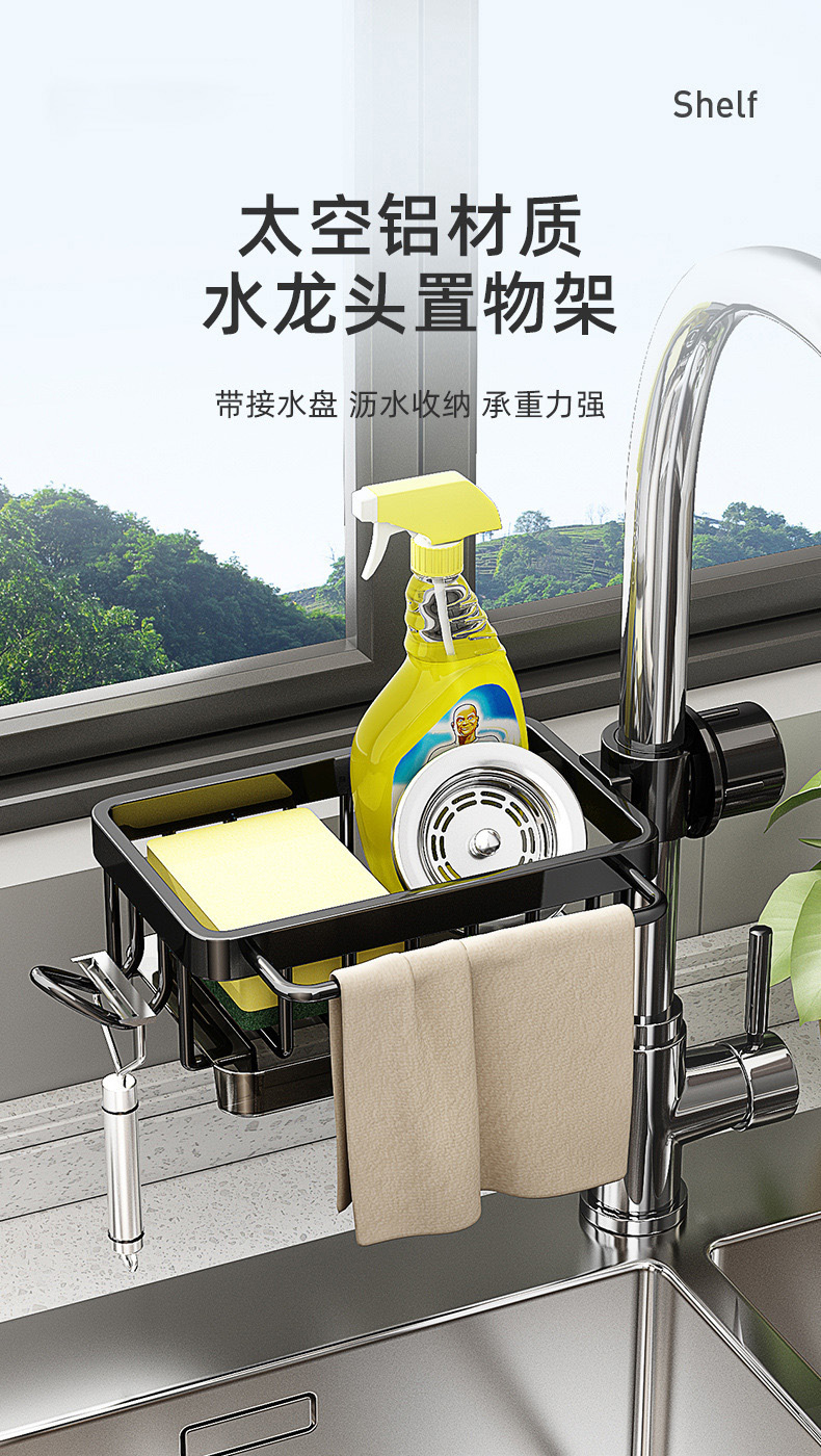 キッチン蛇口収納ラック、食器洗いシンク、シンク用品、家庭用排水バスケット、多機能雑巾収納ラック